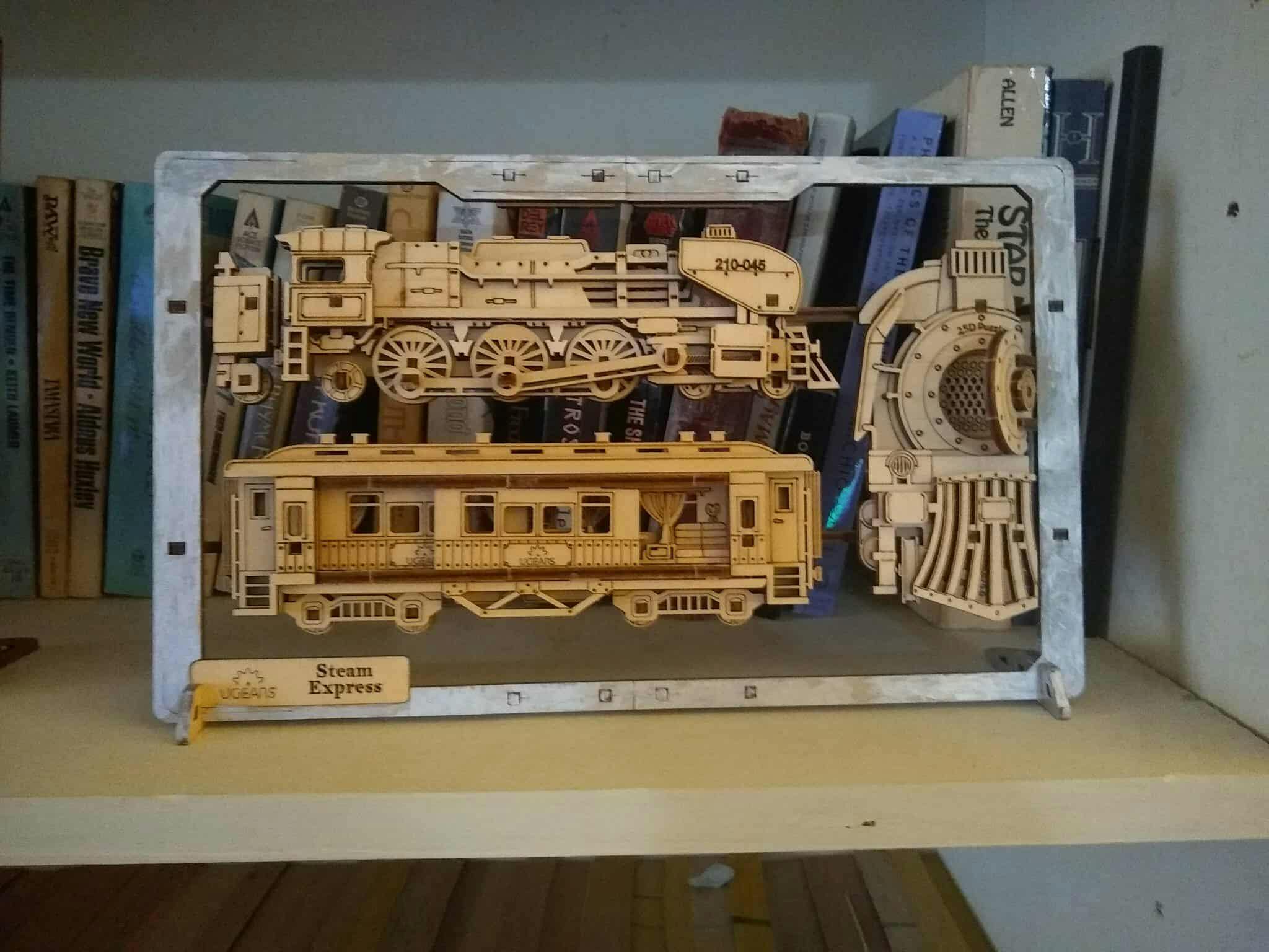 Steam Express 2.5D puzzle by Ugears. Locomotive and passenger car with moving wheels, smokebox hatch, and opening dining car. Hang on the wall or place on a shelf. No glue needed.