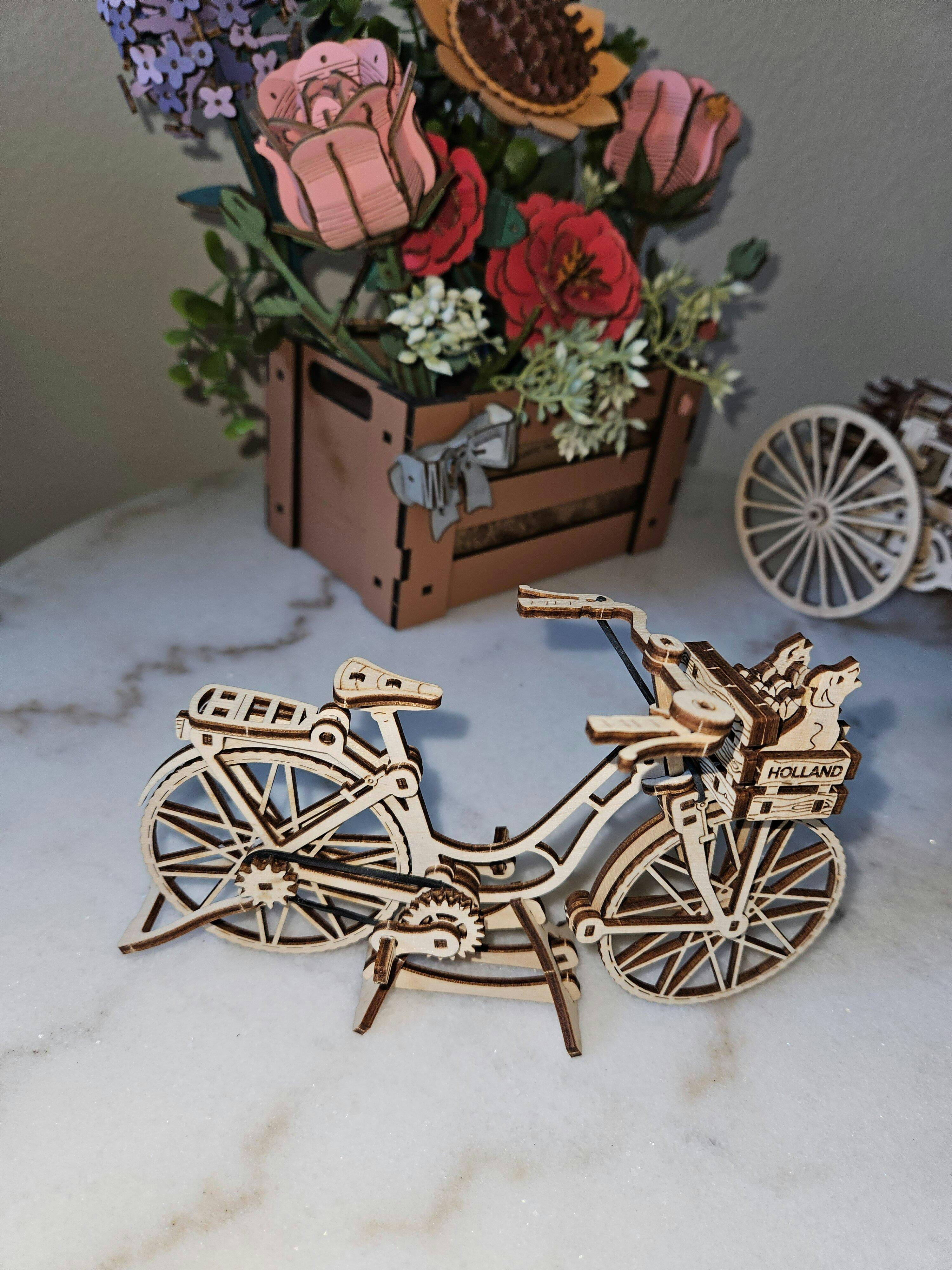 3D wooden puzzle Dutch Bicycle by Ugears. DIY model of the symbol of Amsterdam. No glue or any tools needed. The perfect gift for any age and interests. Amazing interior item.