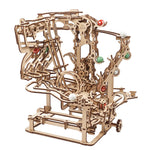 Wooden 3D puzzle Marble Run Chain Hoist from Ugears. DIY model kit. No glue needed. Choose a favorite marble and try to guess which path it will take!