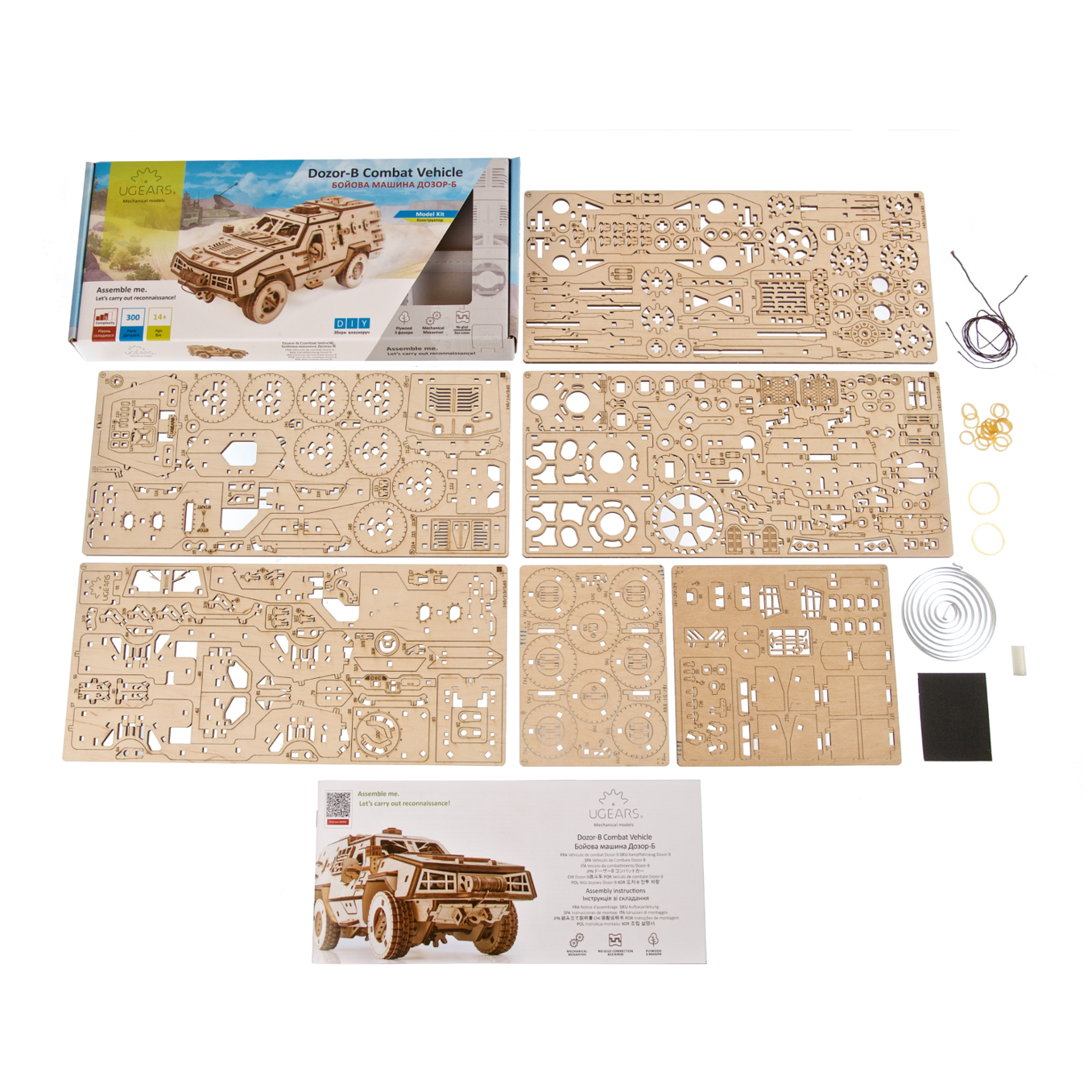 The Dozor-B DIY armored personnel carrier model kit contains 300 parts, is rated "Medium" (for somewhat experienced modelers) and promises 8 hours of exciting construction time. Everything you need to build the Dozor-B Combat Vehicle comes included in the box. No glue or special tools are required. Be sure to closely follow the illustrated, step-by-step instructions in 11 languages (English, Ukrainian, German, Spanish, French, Italian, Portuguese, Polish, Japanese, Chinese, and Korean) for a successful build. Pay special attention to installing the pieces with their correct orientation, and lightly sand and lubricate (with the included piece of wax) all moving parts for optimal function. One great design feature of the Dozor-B Combat Vehicle is that the rubber bands in the suspension system and in the winch mechanism can be replaced, if and when needed, without disassembling the entire model. You can leave your Dozor-B in its attractive natural wood state, paint it military drab, add a camouflage pattern or unleash your inner artist with a color scheme of your choosing. Enjoy hours of imaginative play as your Dozor-B Combat Vehicle carries out patrols, brings aid to civilians, rescues wounded troops, and helps in the defense of the Ukrainian homeland.