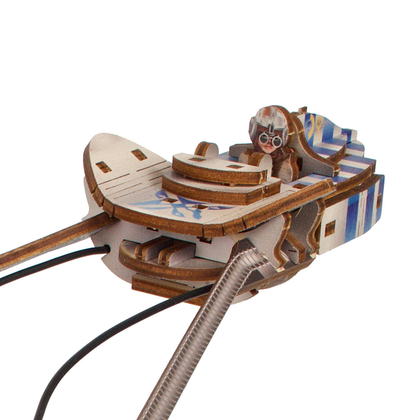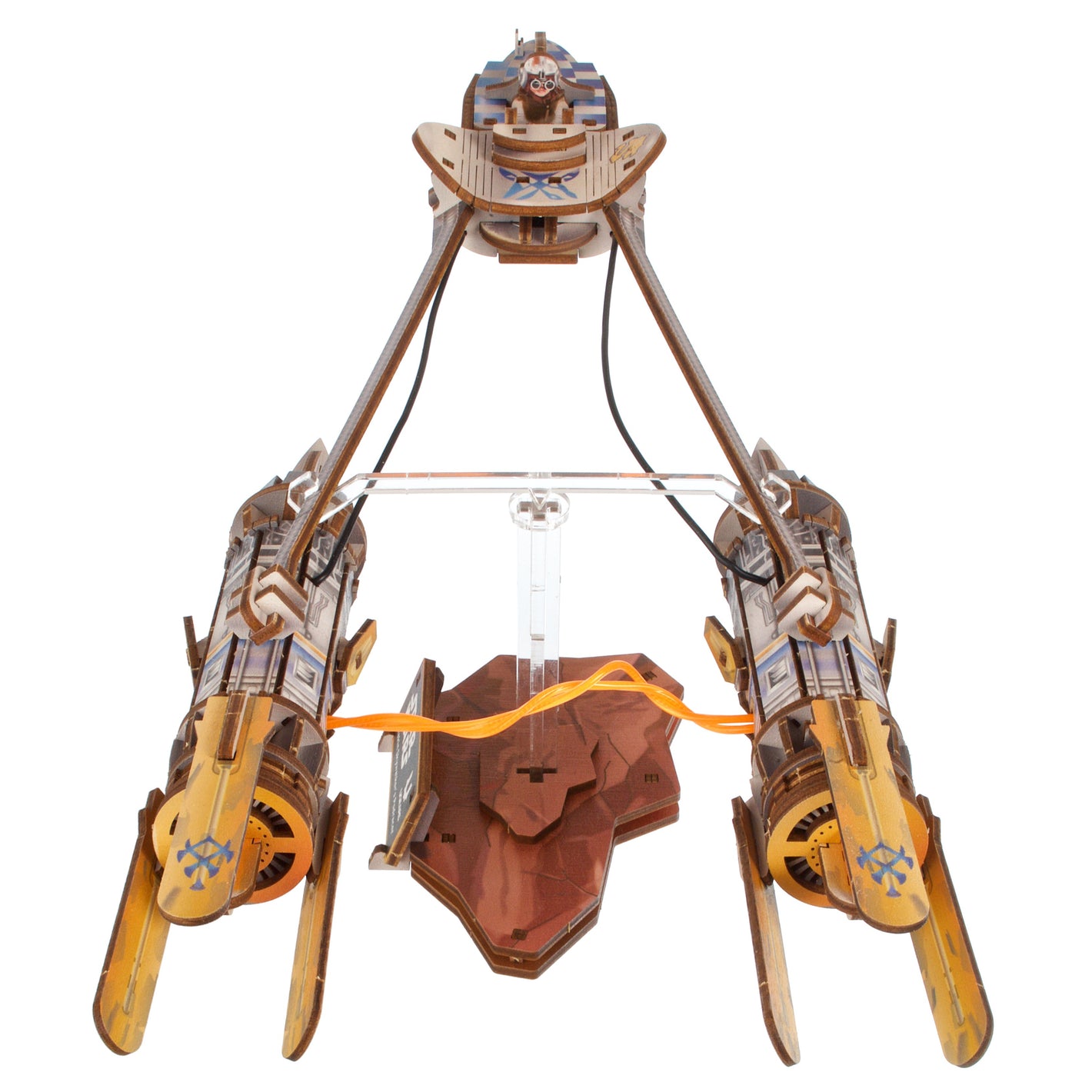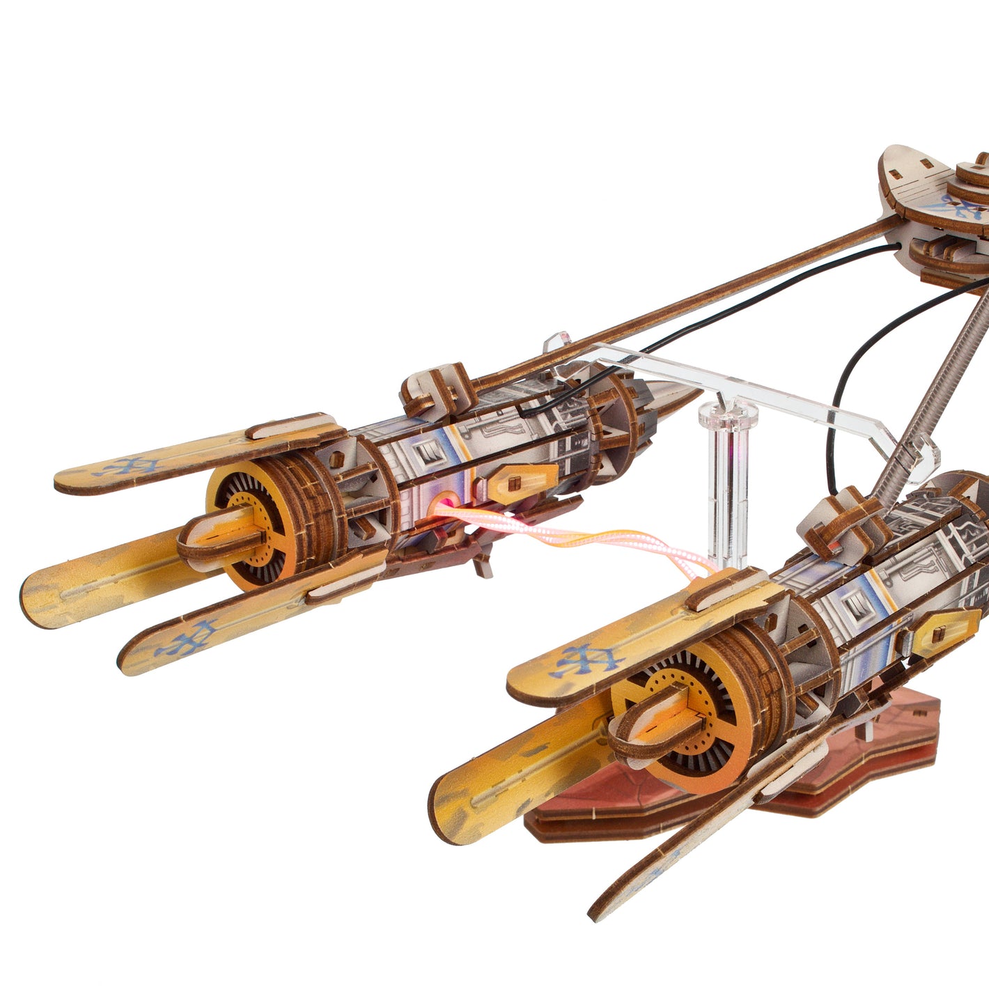 This dynamic model balances and sways to reflect its motion in the film. Twisted LEDs simulate the energy arc between the engines (batteries not included), and colored plywood adds visual depth and accuracy to the model’s design. Two optional Anakin figures: front view and three-quarter view. (While assembling, you can choose one of 2 details.)