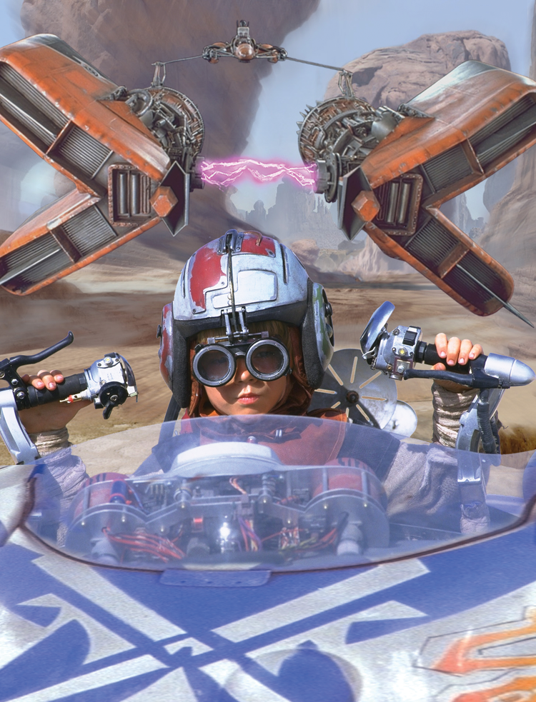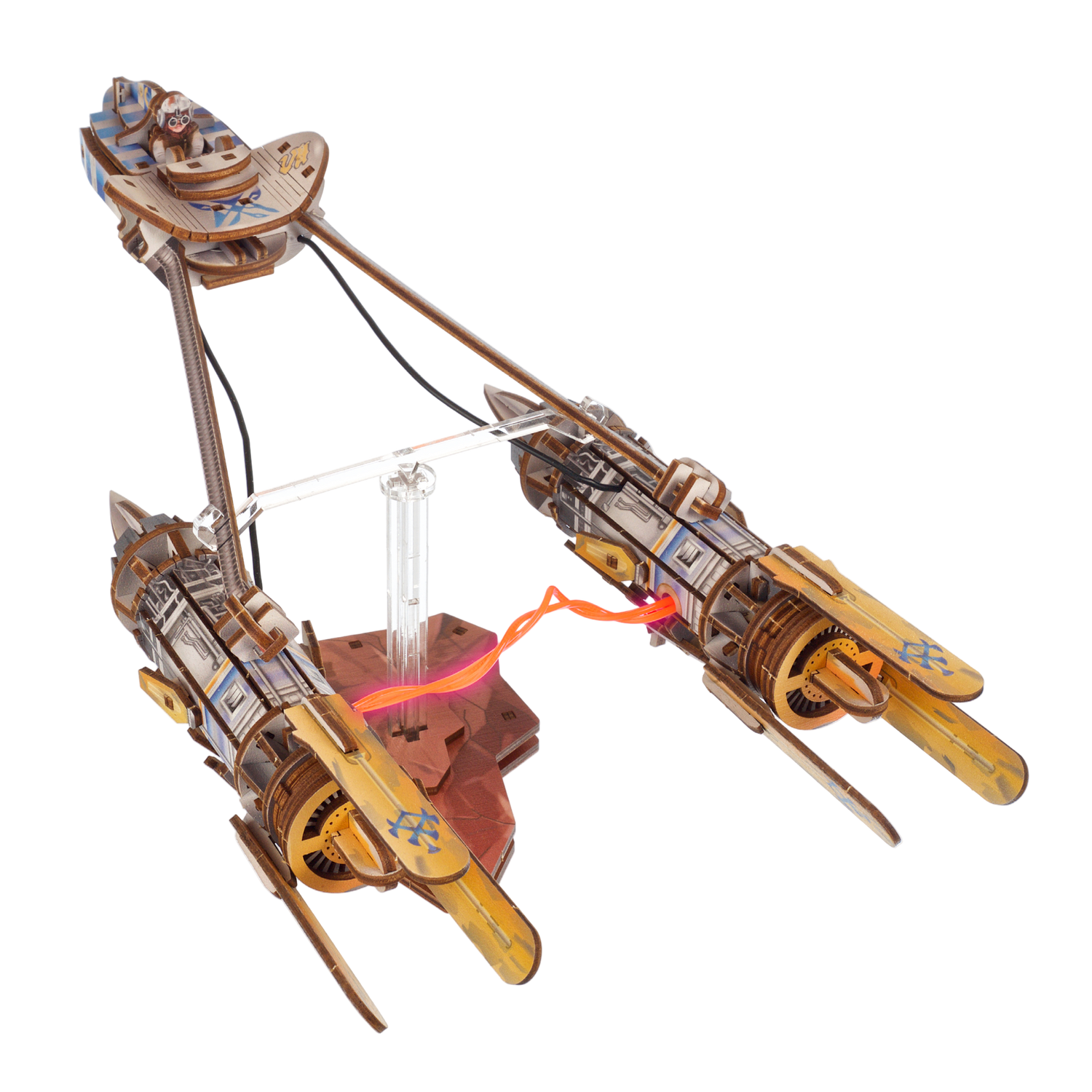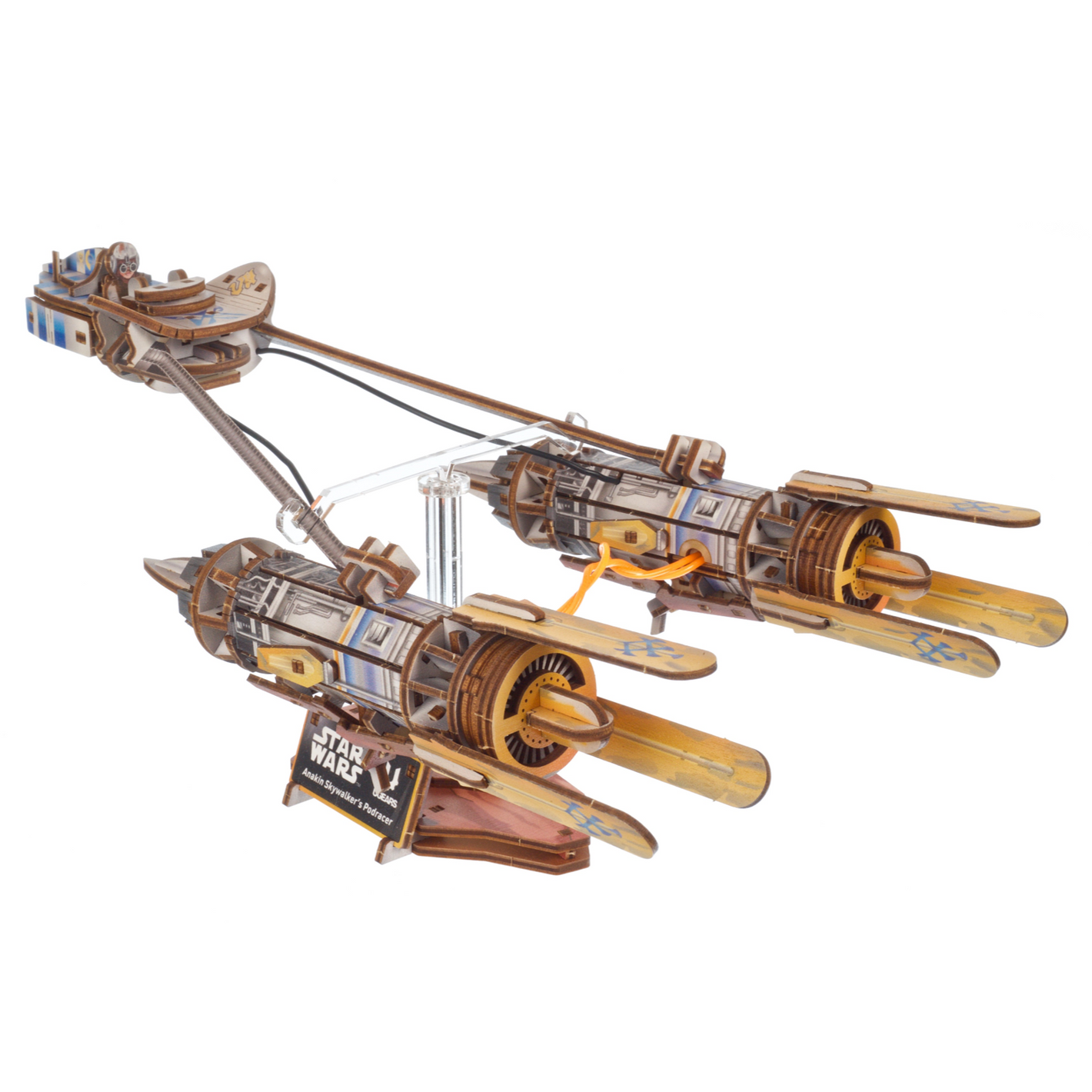 This dynamic model balances and sways to reflect its motion in the film. Twisted LEDs simulate the energy arc between the engines (batteries not included), and colored plywood adds visual depth and accuracy to the model’s design. Two optional Anakin figures: front view and three-quarter view. (While assembling, you can choose one of 2 details.)