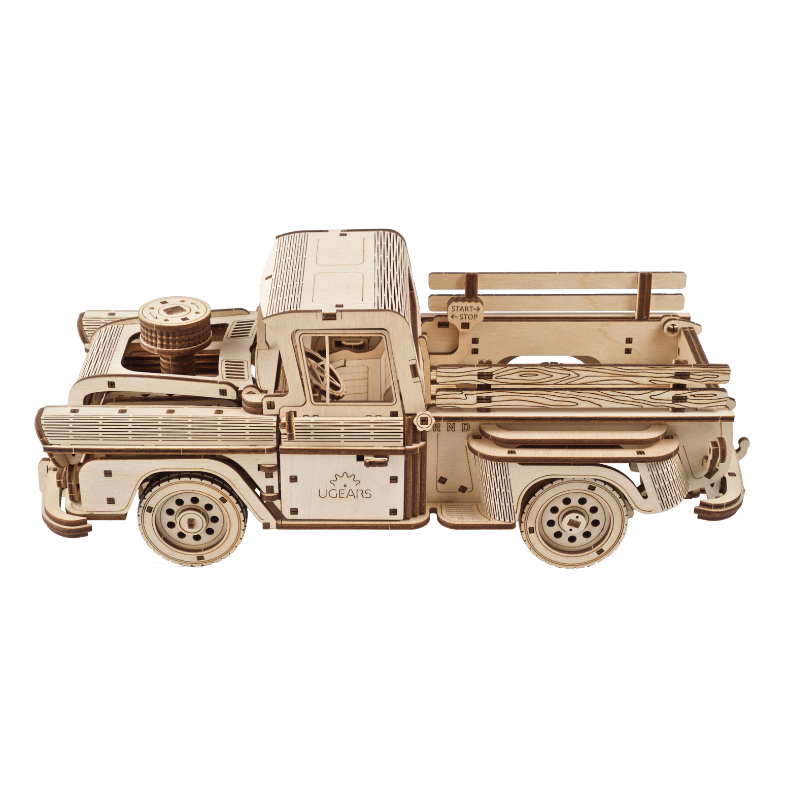 Der Pick-up Lumberjack hat 3 Modi: R (Rückwärtsgang), N (Leerlauf), D (Vorwärtsgang). Die Energie der Feder wird auf Zahnräder übertragen, um das Übersetzungsverhältnis zu erhöhen, und dann über das Getriebe auf die Antriebswelle, das Differential und die Hinterachse. Mit einem Start/Stopp-Mechanismus in der Ladefläche können Sie den Truck auf Kommando starten. Da wir uns bei Ugears auf die kleinen, skurrilen Details konzentrieren, die ein Modell außergewöhnlich machen, simuliert ein kleines Pendel unter den Sitzen das Schütteln vom starken Motor. Gebogenes Sperrholz verleiht dem Modell schöne Linien und einen Stil der 1950er Jahre. Die Türen des Pickups lassen sich von innen und außen öffnen und die Heckklappe lässt sich herunterklappen. Die Vorderräder lassen sich mit dem Lenkrad drehen und für elegante Kurvenfahrten festmachen. Der Pick-up Lumberjack hat außerdem vorne und hinten eine Federung, damit Sie auf den Landstraßen nicht zu sehr durchgeschüttelt werden.