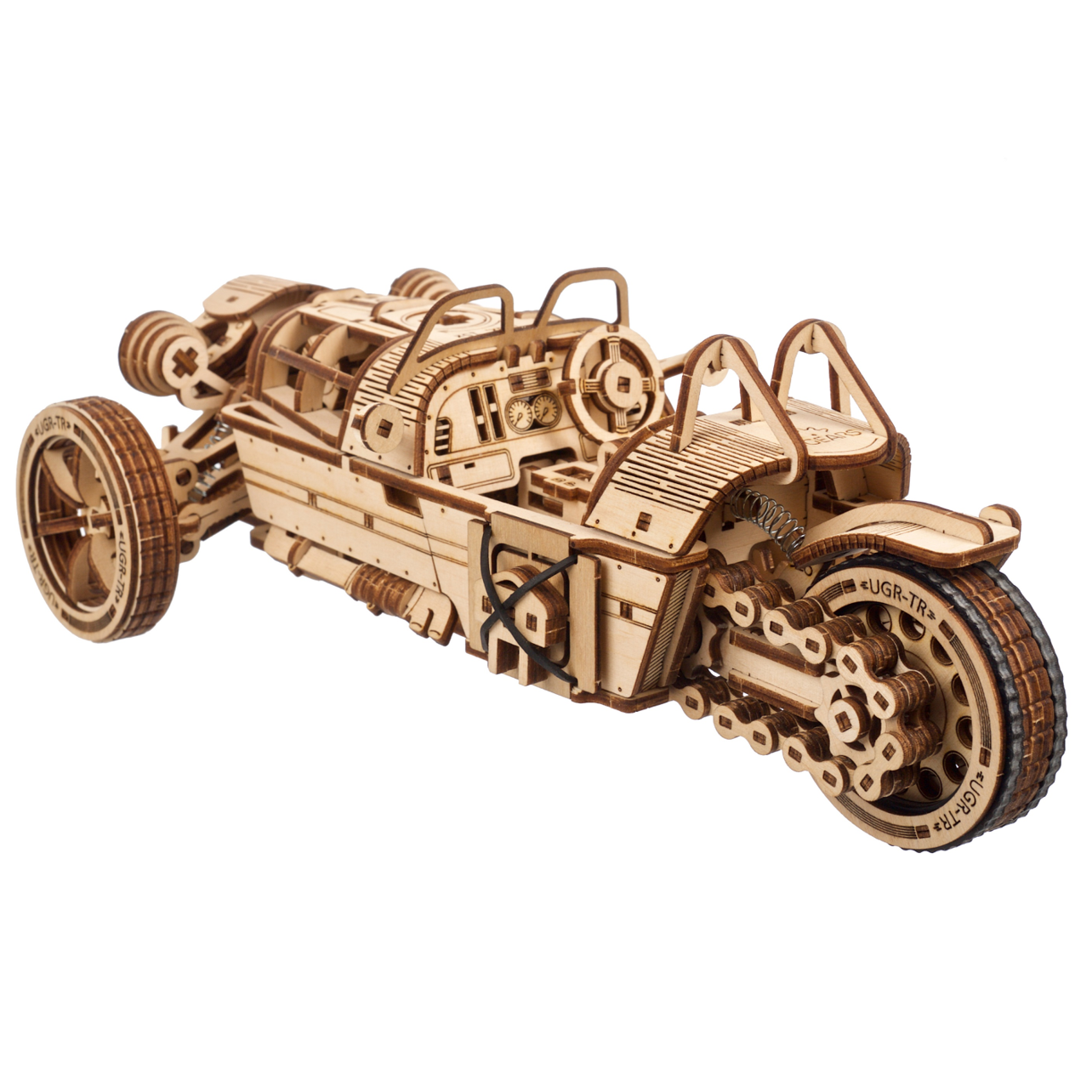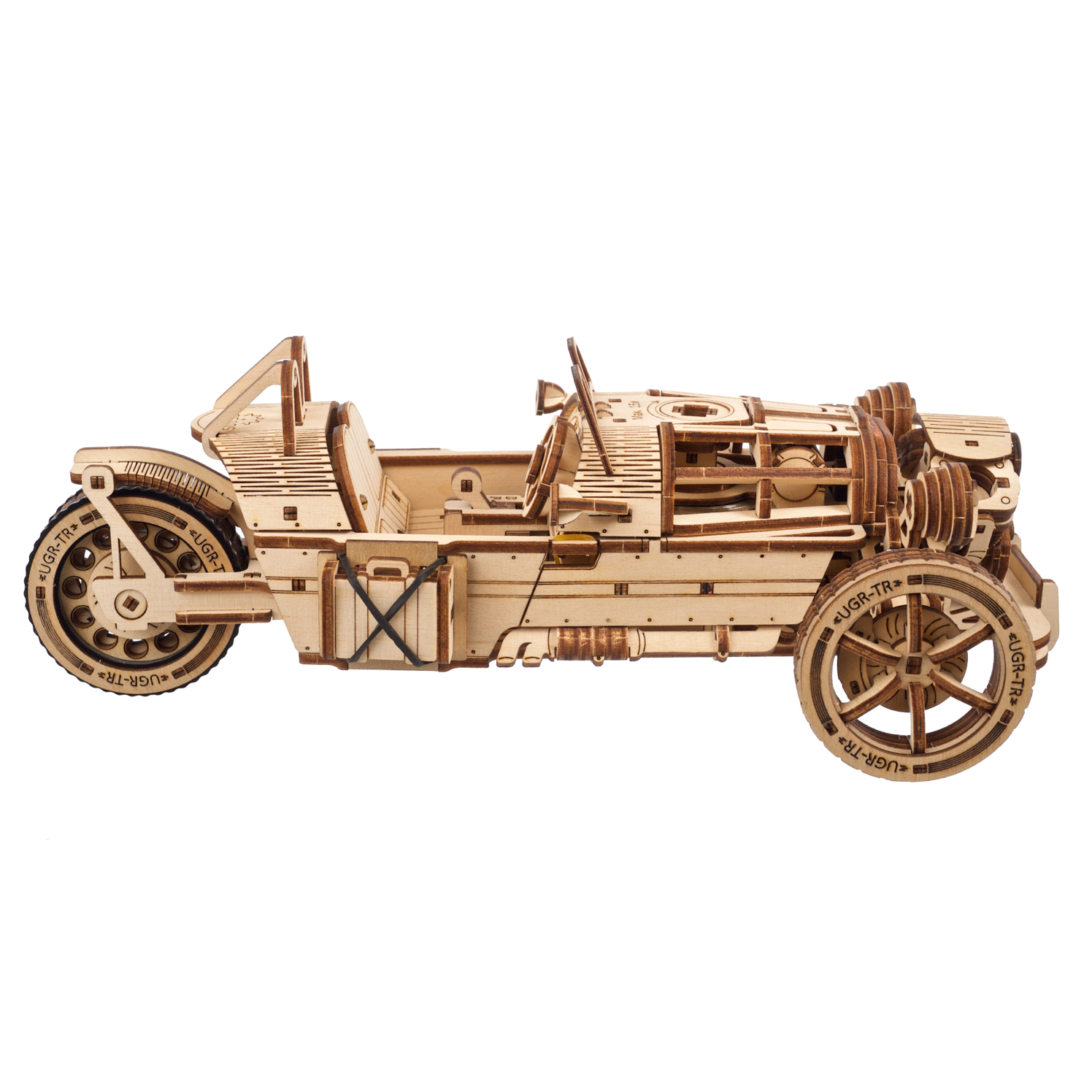 3D Puzzle Dreiradfahrzeug UGR-S von Ugears kann rund 4 Meter auf gerader Strecke zurücklegen oder, wenn man die Räder mithilfe graziöse Kurven fahren. Die perfekte Geschenkidee!