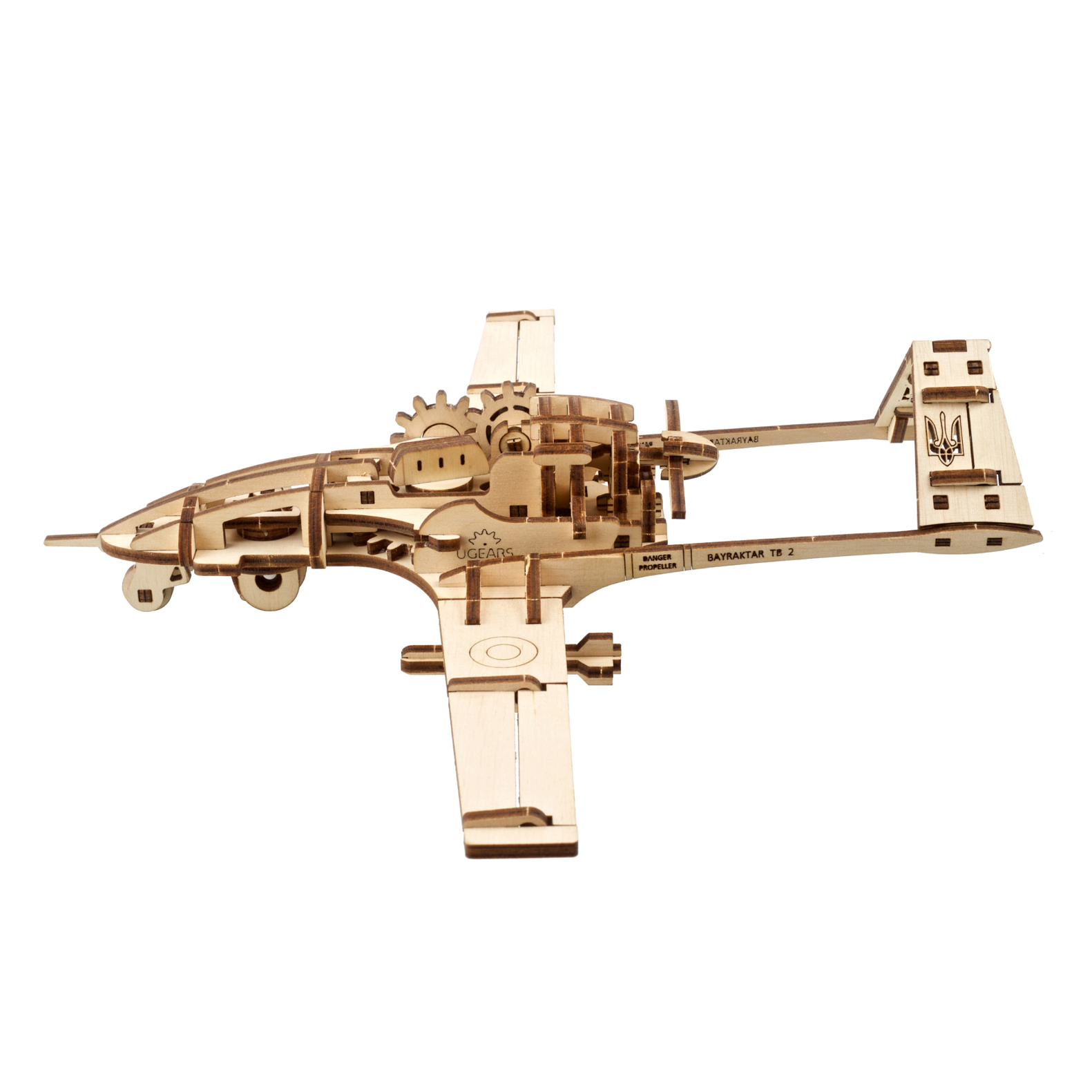 3D-Puzzle Kampfdrohne Bayraktar TB2 von Ugears. Bewegliche Ruder, Überwachungskamera und lösbare Flugkörper. Keine Batterien. Kein Klebstoff.