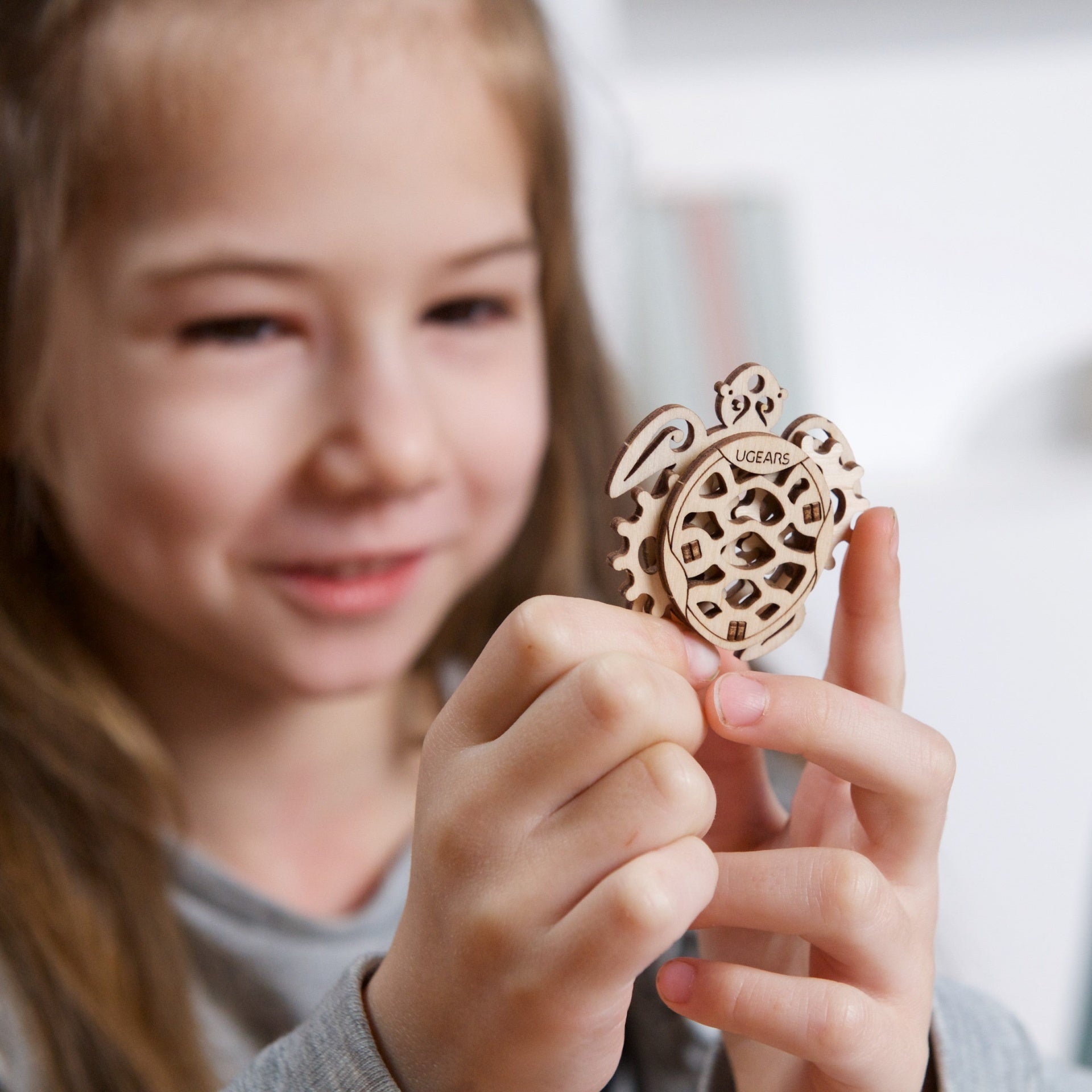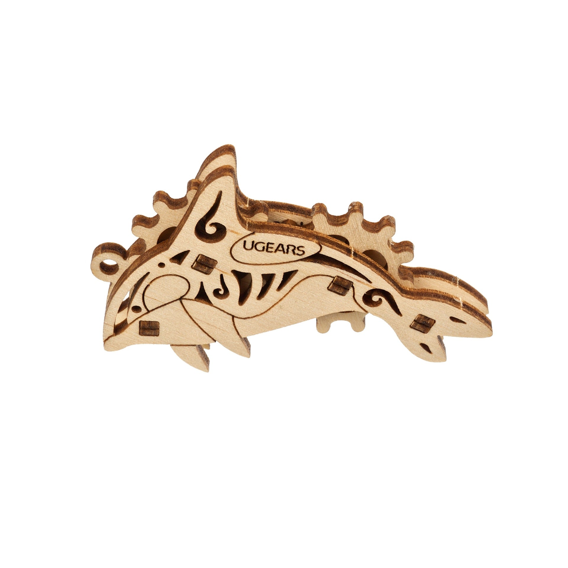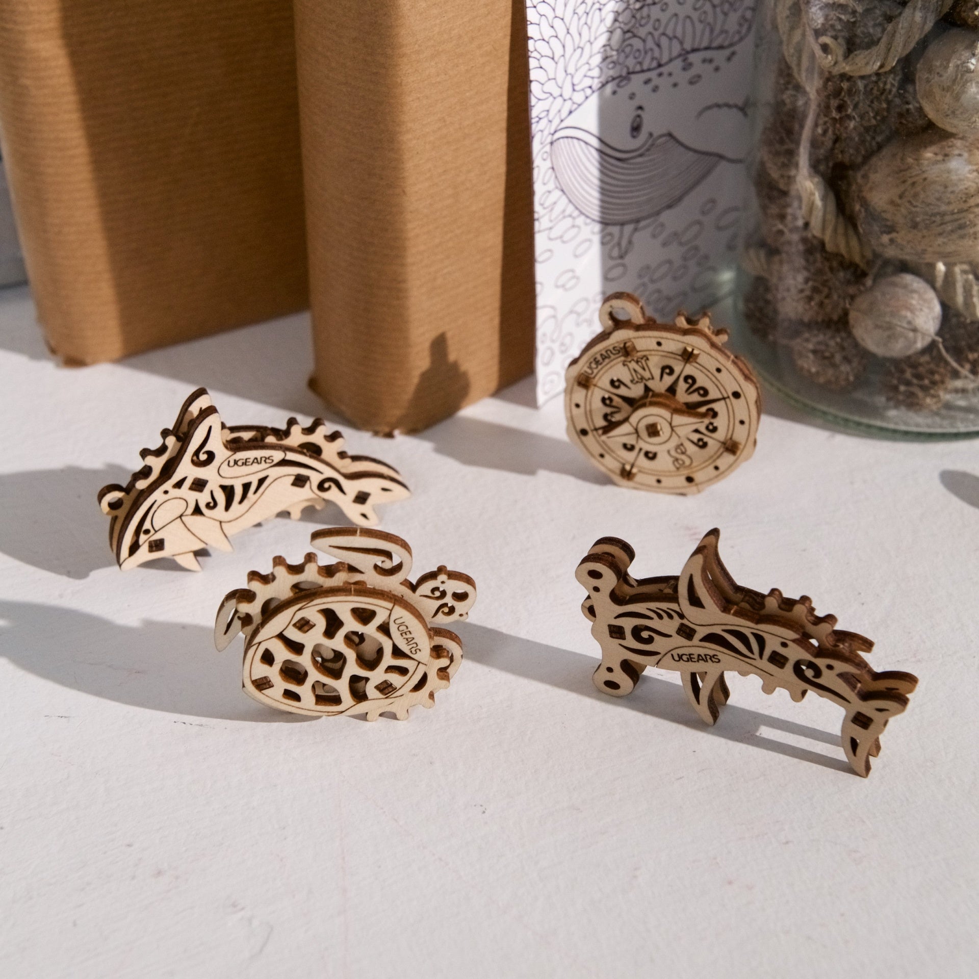 Mini-Modellbausatz Fidgets Atlantischer Ozean von Ugears. Kompass, Delfin, Meeresschildkröte, Hammerhai. Jedes der DIY-Fidgets verfügt über ein drehbares Element. Kein Klebstoff.
