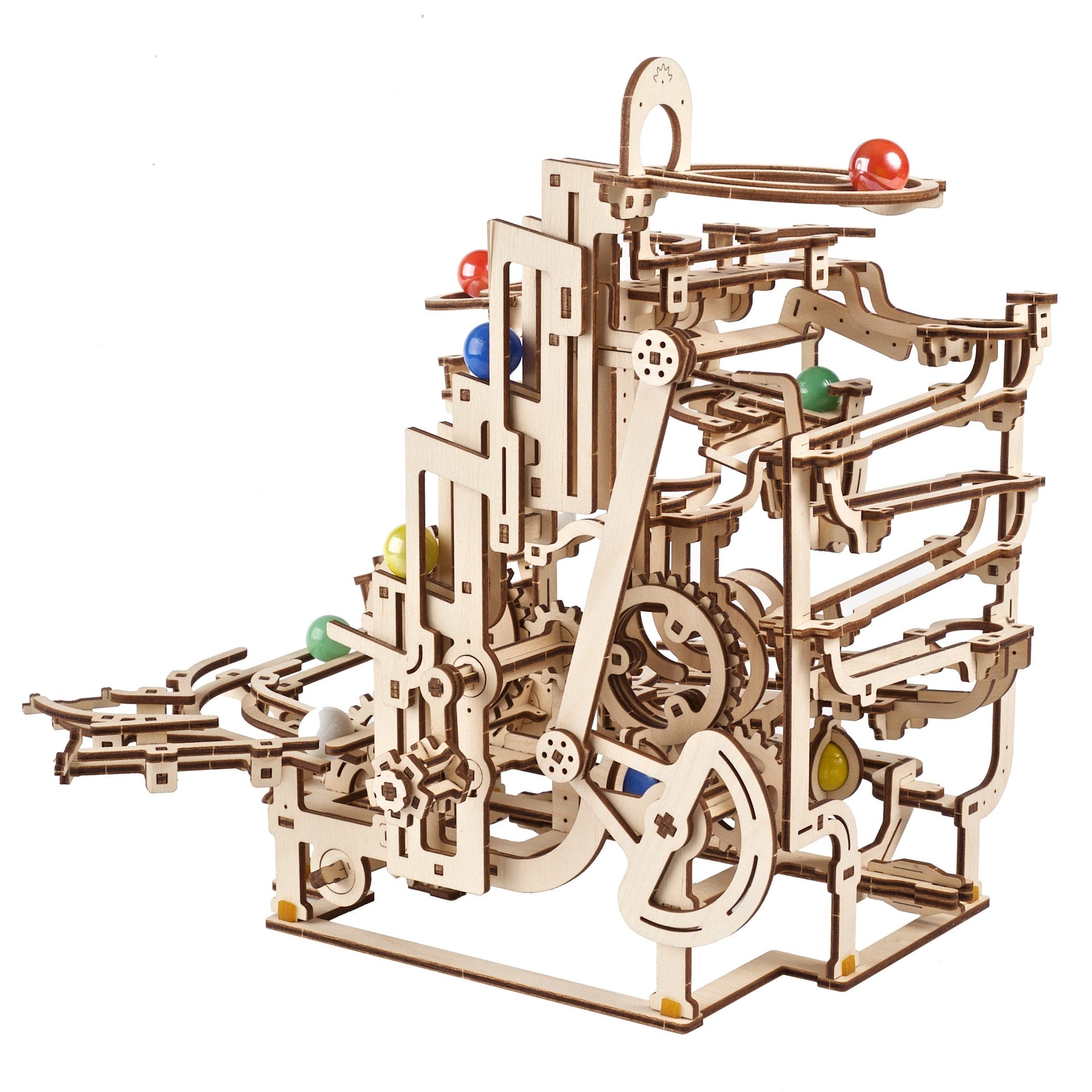 3D-Holzpuzzle Murmelbahn mit Stufenwinde von Ugears. DIY Modellbausatz. Ohne Klebstoff. Wählen Sie Ihre Lieblingsmurmel und erraten Sie, welchen Weg sie nehmen wird!