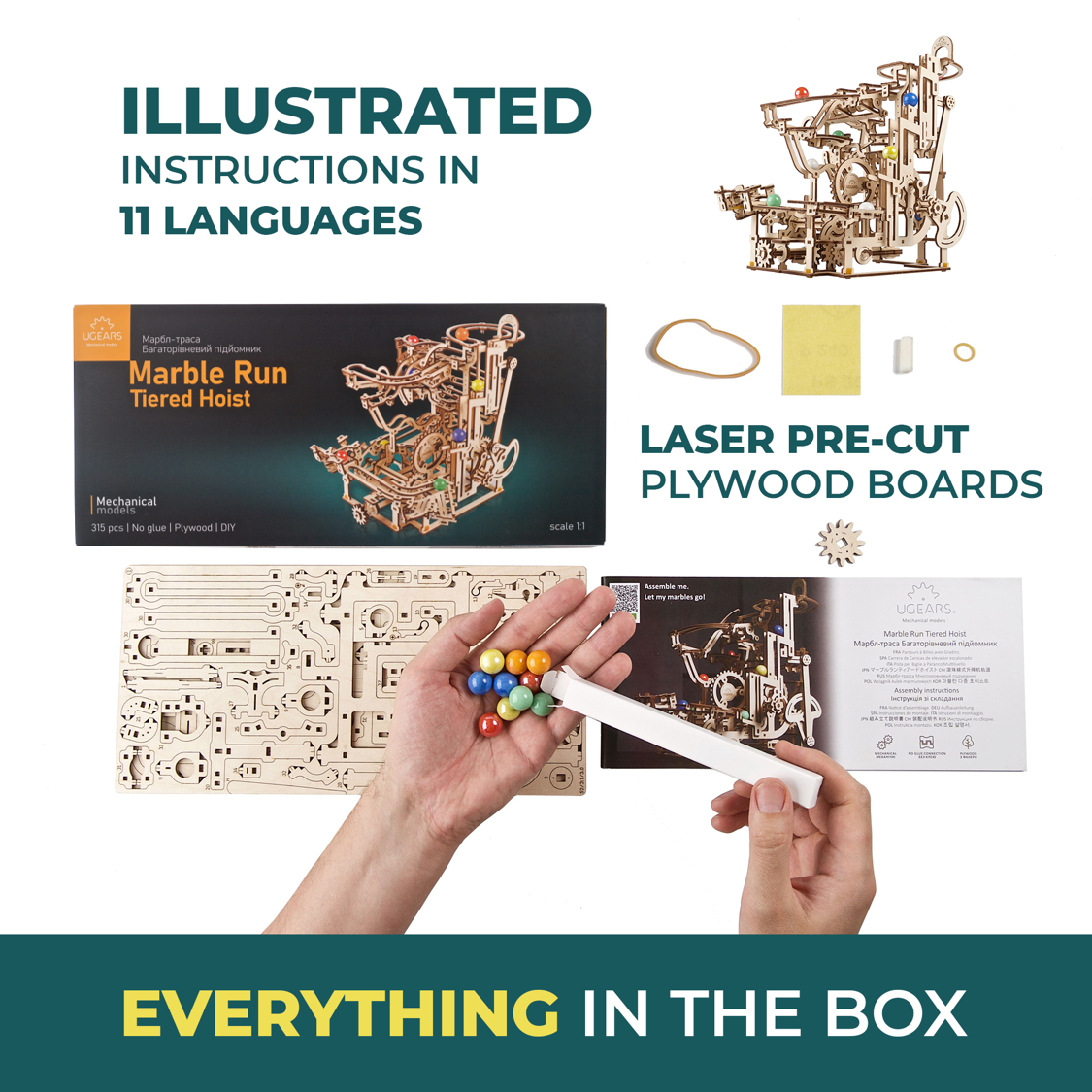 Wir haben die Murmelbahn mit Etagenaufzug wie auch die gesamte Murmelbahn-Reihe von Ugears modular gestaltet, d.h., die Bahn mit Etagenaufzug funktioniert sowohl allein, kann aber auch frontal oder seitlich mit anderen Ugears-Murmelbahnen des gleichen oder eines anderen Typs verbunden werden (mithilfe spezieller mitgelieferter Verbindungselemente können 2 oder 4 Modelle verbunden werden, jeweils paarweise). Ein Auslösemechanismus direkt vor der Rücklaufbahn kann die Murmeln zurück zu dem Spiralaufzug oder zu einer benachbarten Murmelbahn senden, oder aber zwischen beiden hin- und herschalten (Sie können Ihre Vorliebe mithilfe einer Zugverriegelung festlegen). Verbinden Sie bis zu vier Murmelbahnen, um ein begeisterndes komplexes System aus miteinander verbundenen Elementen zu erhalten, die alle von einer einzigen Kurbel angetrieben werden. Es ist, als seien die Murmeln losgeschickt worden, damit sie einen schönen Tag in einem Miniatur-Vergnügungspark verbringen!