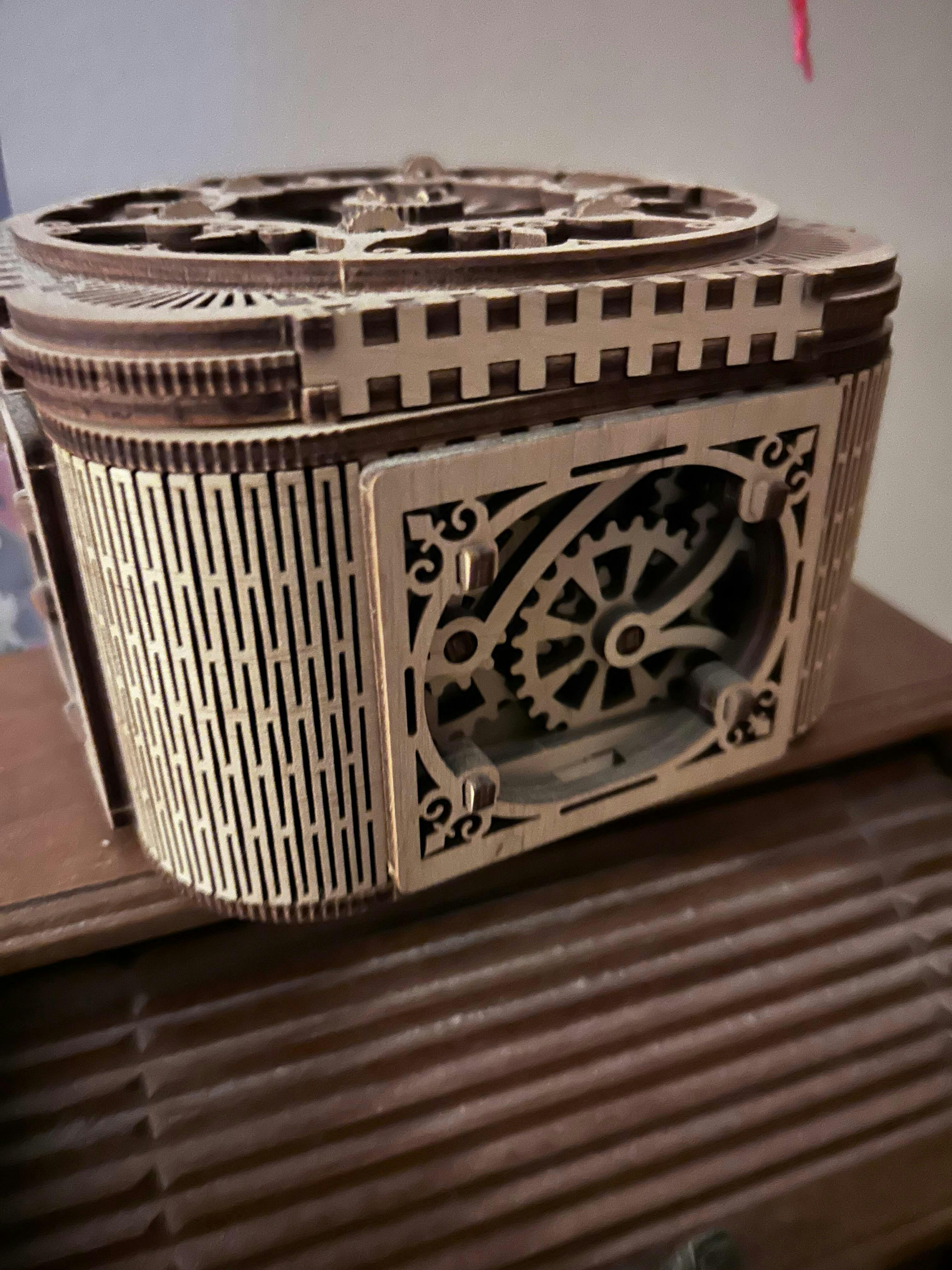 But, we bought this treasure box and I trying to collect it. It is terrible, few timed I thought that we catch some fake product... I have proceeded strictly according to instructions, used wax and sandpaper, but no... Some details put on their place only after strong pushes, some breaks after few tries, but there were spare details and I understand why they needed.... I leave this process maybe 5-7 times and then return in one week because it cause very angry emotions... And I done it, today! But it does not work. The upper cover opens only manually and not smoothly going, I feel that something wrong there. Key which need to use didn't works, it cant roll in keyhole at all. I just want to save time and emotions of users, please look on other products of UGEARS, this box it terrible...