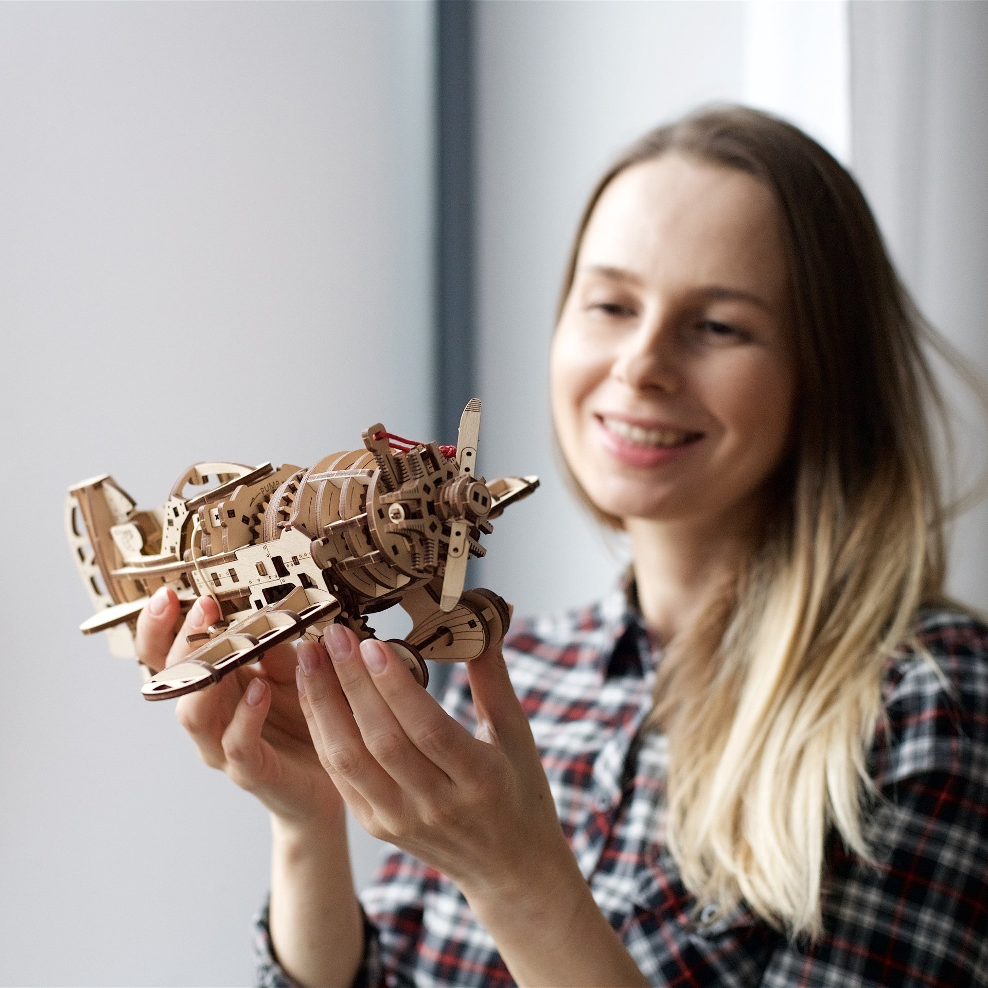 Ugears ist weltweit für seine wundervollen Modellbausätze und 3D-Puzzles aus Holz bekannt, zu denen u.a. Fahrzeuge aller Art gehören — Autos, Lastwagen, Motorräder, Züge, Schiffe und Flugzeuge. Die Verrückte Hornisse ist unser derzeit schönstes und komplexestes Flugzeugmodell. Wir sind außerdem für unseren Retro- oder Steampunk-Stil bekannt, so dass dieses kurze und gedrungene rasende Flugzeug aus den 1930er Jahren genau das Richtige war für ein Flugzeug im charakteristischen Ugears-Stil. Die verrückte Hornisse ist eine attraktive Dekoration für Ihr Zuhause oder fürs Büro, aber mit all ihrer Technik ist sie eigentlich eher zum phantasievollen Spiel vorgesehen, besonders beim Zurschaustellen der Vorflug-Sequenz. Wenn sich der Propeller der Verrückten Hornisse parallel zu den sich bewegenden Flügelklappen und dem Ruder dreht, ist das echt cool, aber der gesamte Ablauf, bei dem das Flugzeugmodell nach der Vorflugkontrolle zu rollen beginnt, ist einzigartig in unserer Sammlung.