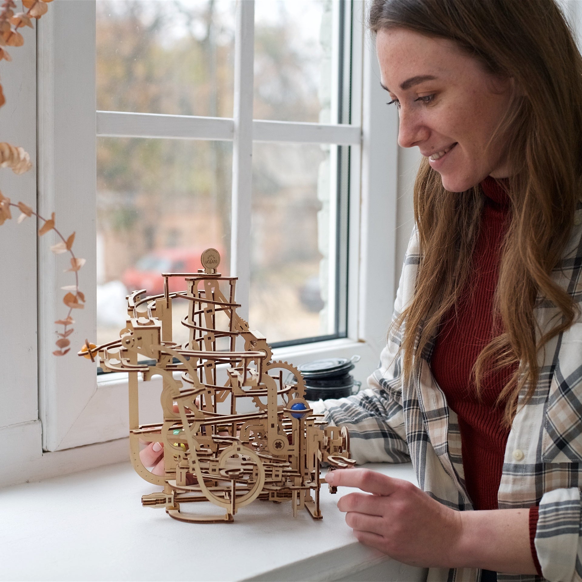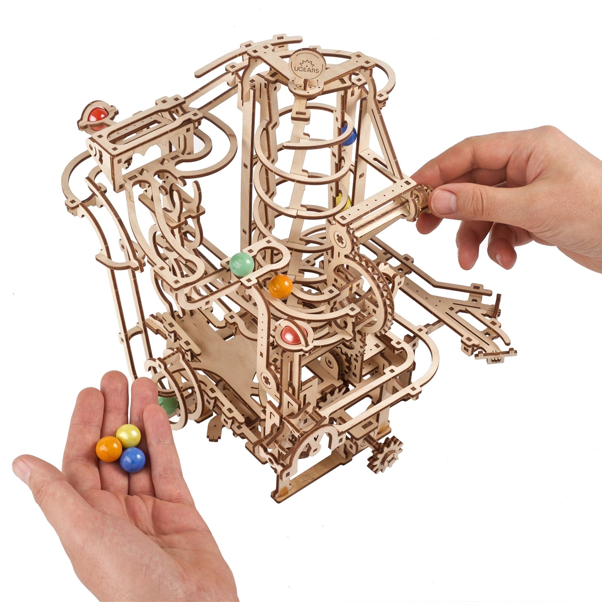 Die Murmelbahn mit Spiralaufzug ist das vierte Modell der Ugears-Serie mit faszinierenden mechanischen Murmelbahnen aus Holz zum Selberbauen. Murmelbahnen haben etwas Faszinierendes. Kinder und Erwachsene können stundenlang den Bewegungen dieser magischen Geräte zusehen und die Murmelbahn mit Spiralaufzug von Ugears verspricht schier endloses Vergnügen für Jung und Alt. Entdecken Sie beim Bau dieses aufregenden mechanischen 3D-Puzzles, dass auch in Ihnen technisches Talent steckt. Und wenn Sie Freude an Herausforderungen haben, warum bauen Sie dann nicht alle vier Murmelbahnen zusammen, um den Spaß zu vervierfachen? Sie können das Modell in seinem attraktiven Naturholz-Zustand belassen oder Ihrer künstlerischen Ader freien Lauf lassen und es in verschiedenen Farben bemalen, wie es viele Ugears-Fans in aller Welt tun.