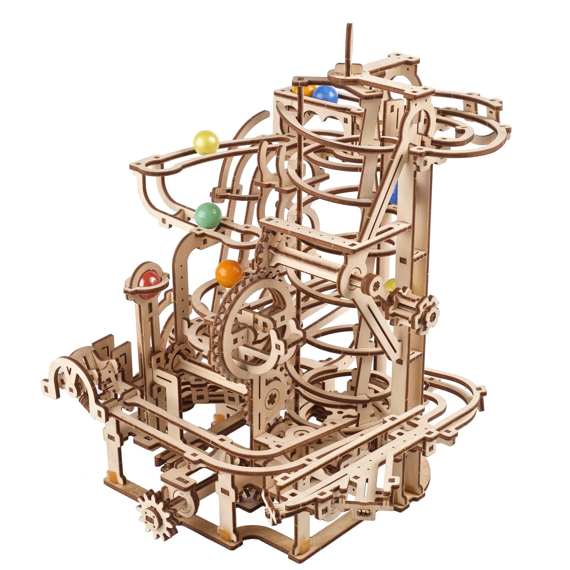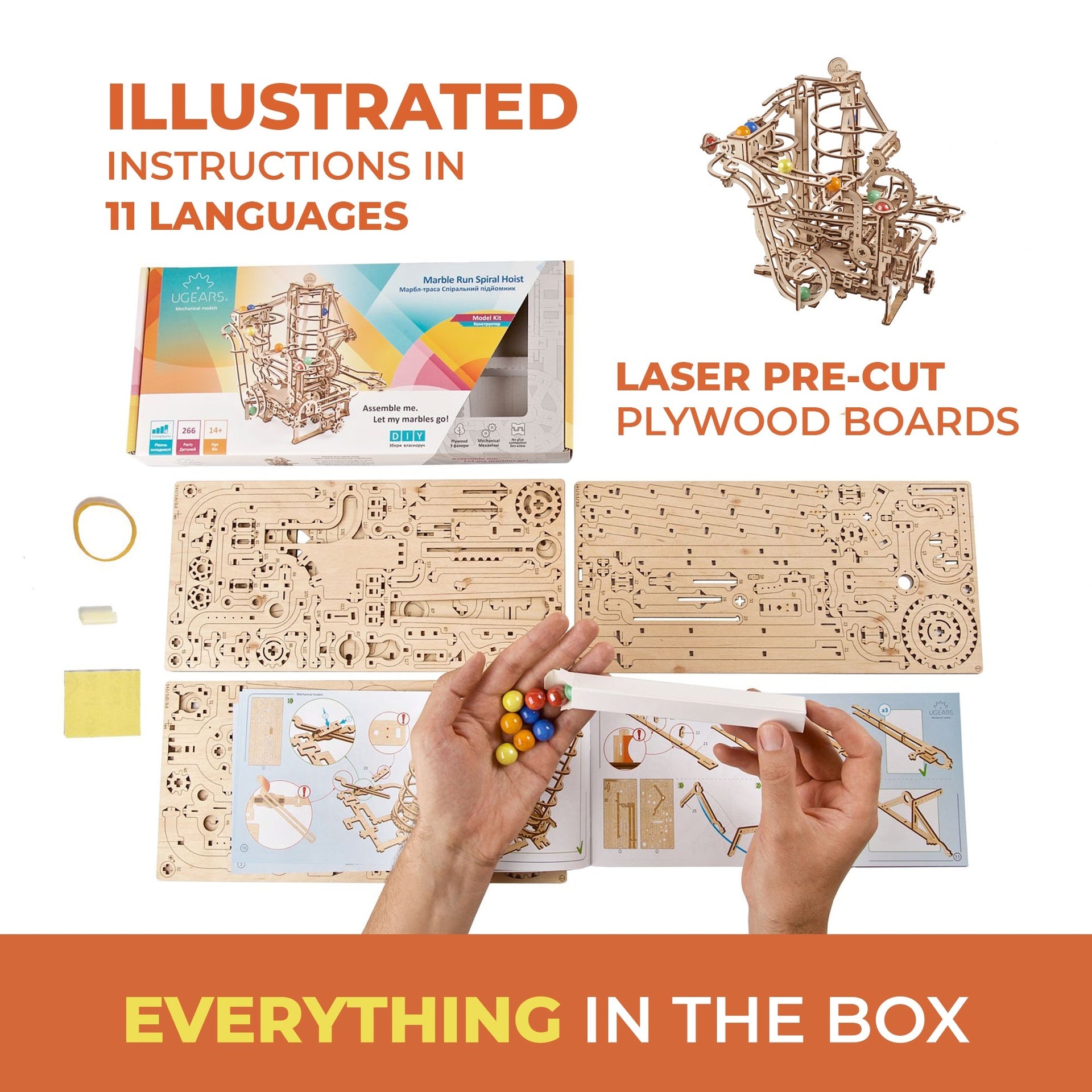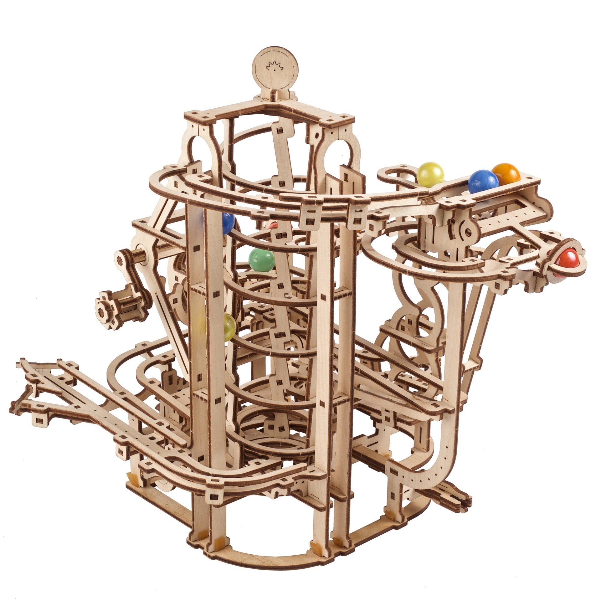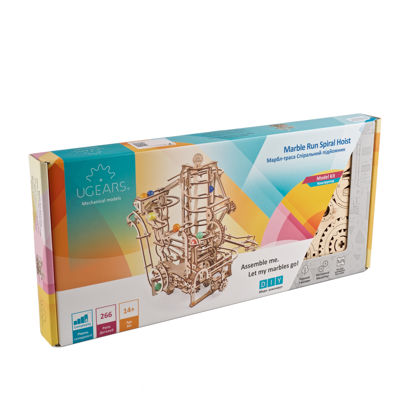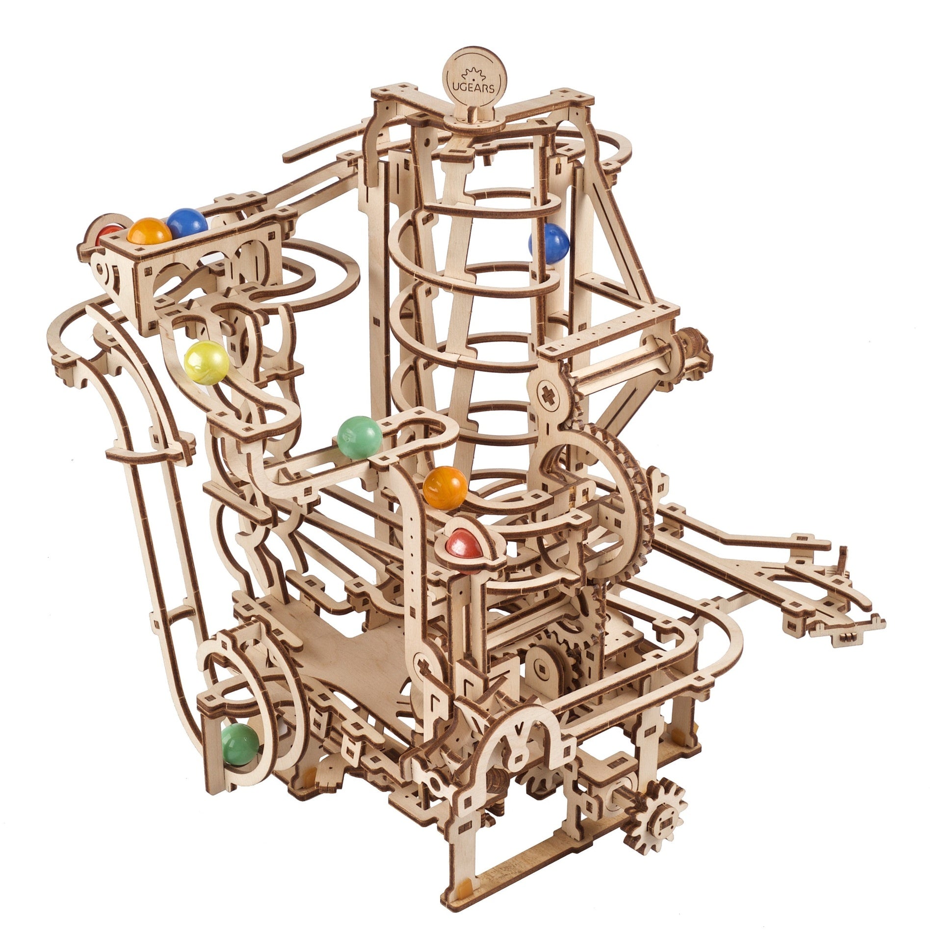3D-Holzpuzzle Murmelbahn mit Spiralaufzug von Ugears. DIY Modellbausatz. Ohne Klebstoff. Wählen Sie Ihre Lieblingsmurmel und raten Sie, welchen Weg sie nimmt!