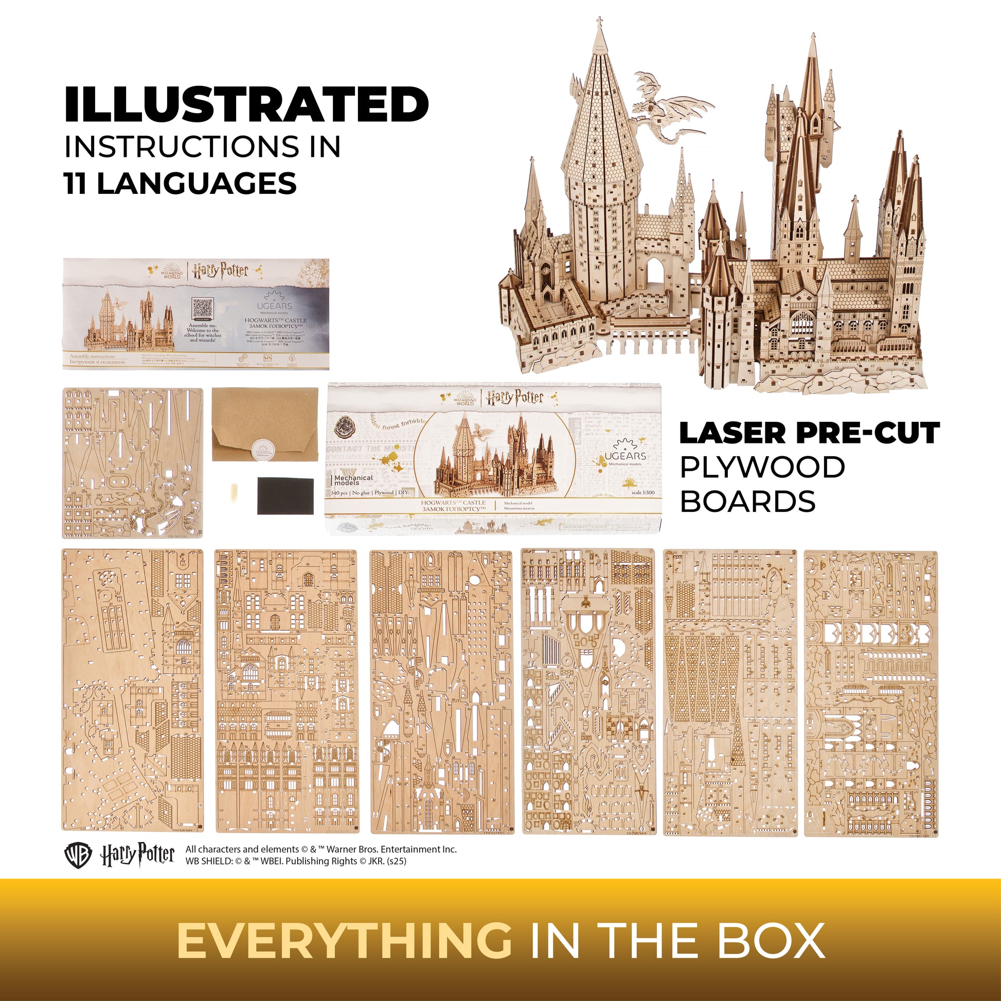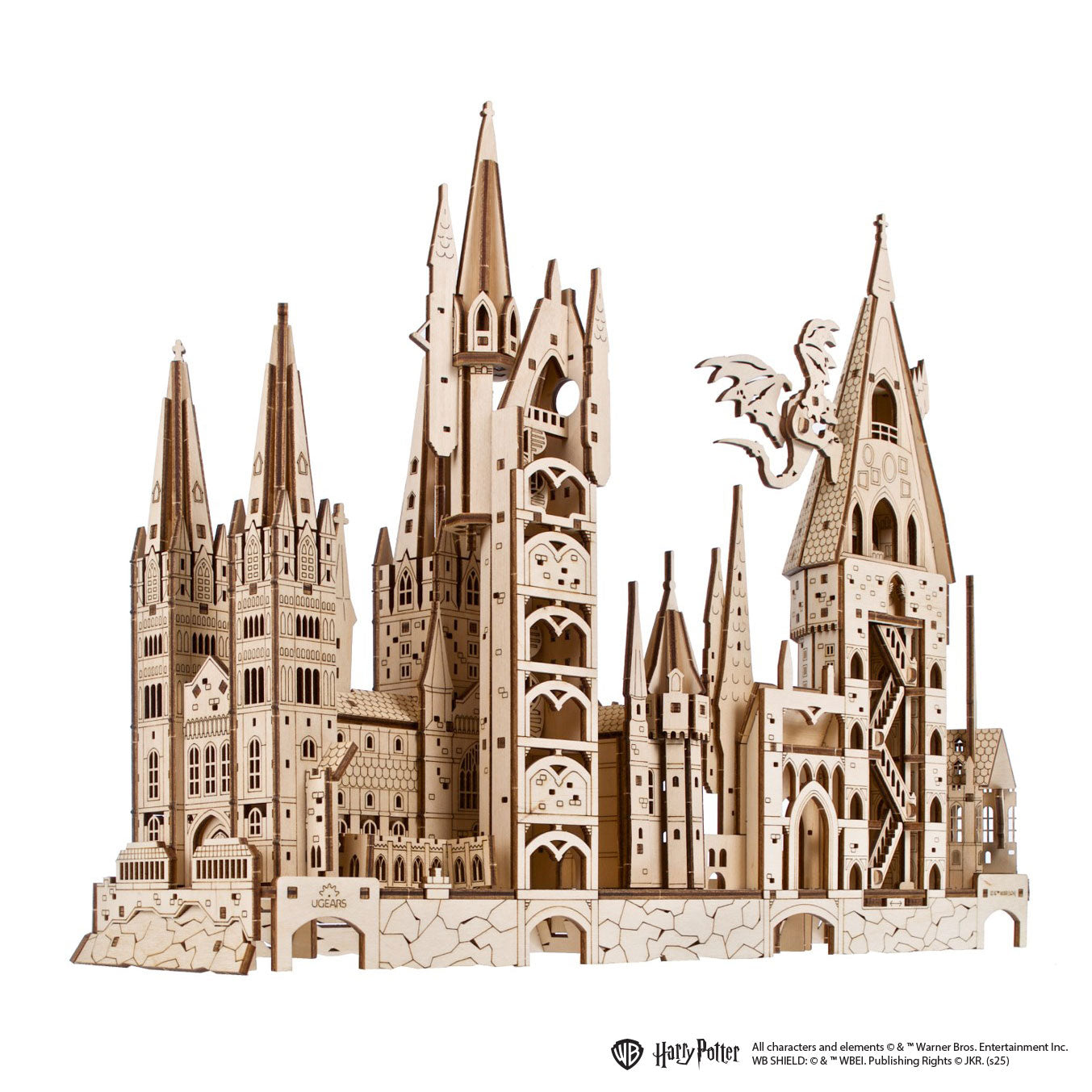 Puzzle 3D de madera del Castillo de Hogwarts™ de la serie Harry Potter™ de Ugears. El castillo tiene elementos móviles: escaleras y alas de dragón. Un regalo ideal para todos