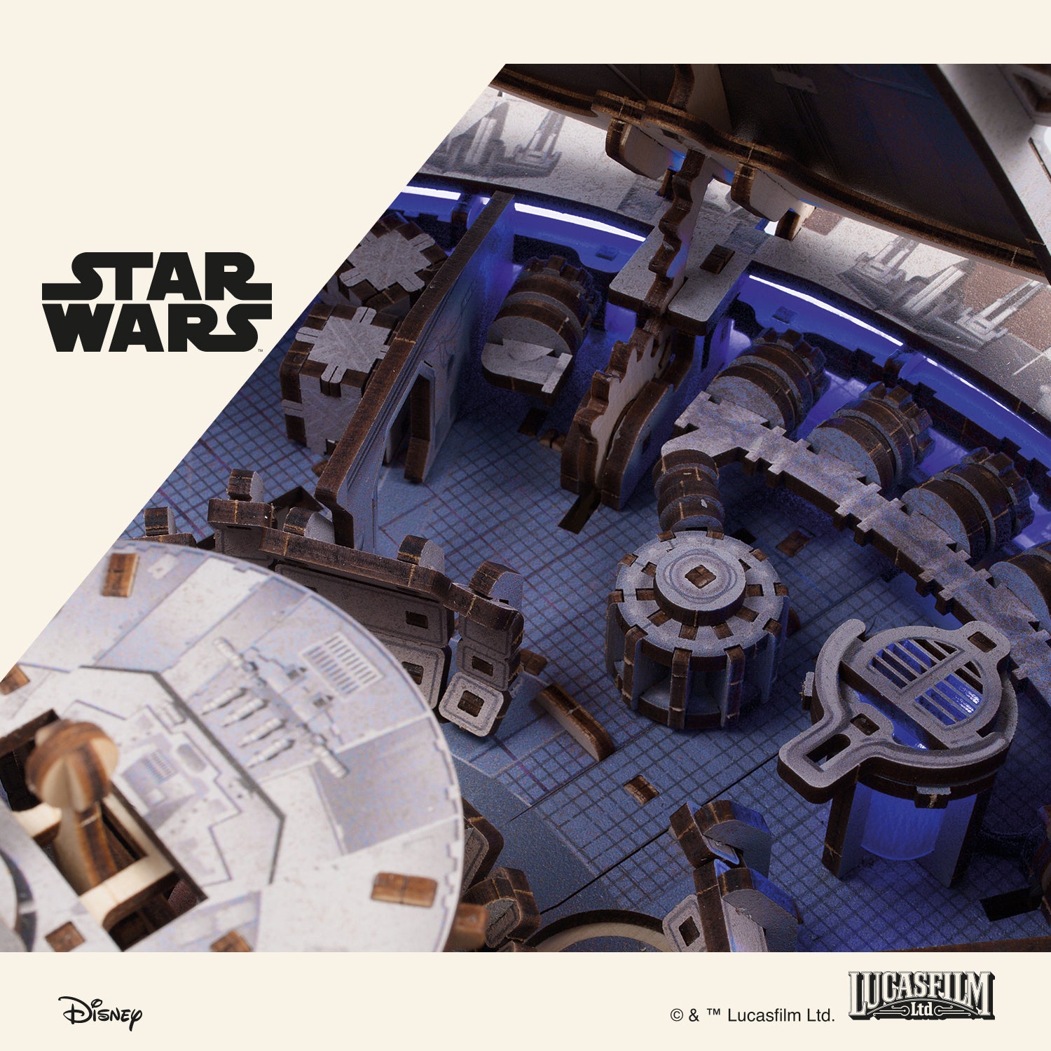 ¡Construye el legendario Millennium Falcon™ con este detallado rompecabezas de madera 3D! Incluye luces LED azules a pilas, techo retráctil, bodega de carga y rampa abatibles, torretas móviles y una antena giratoria de 360°. Los intrincados detalles interiores y exteriores reproducen fielmente la icónica nave de la saga Star Wars™