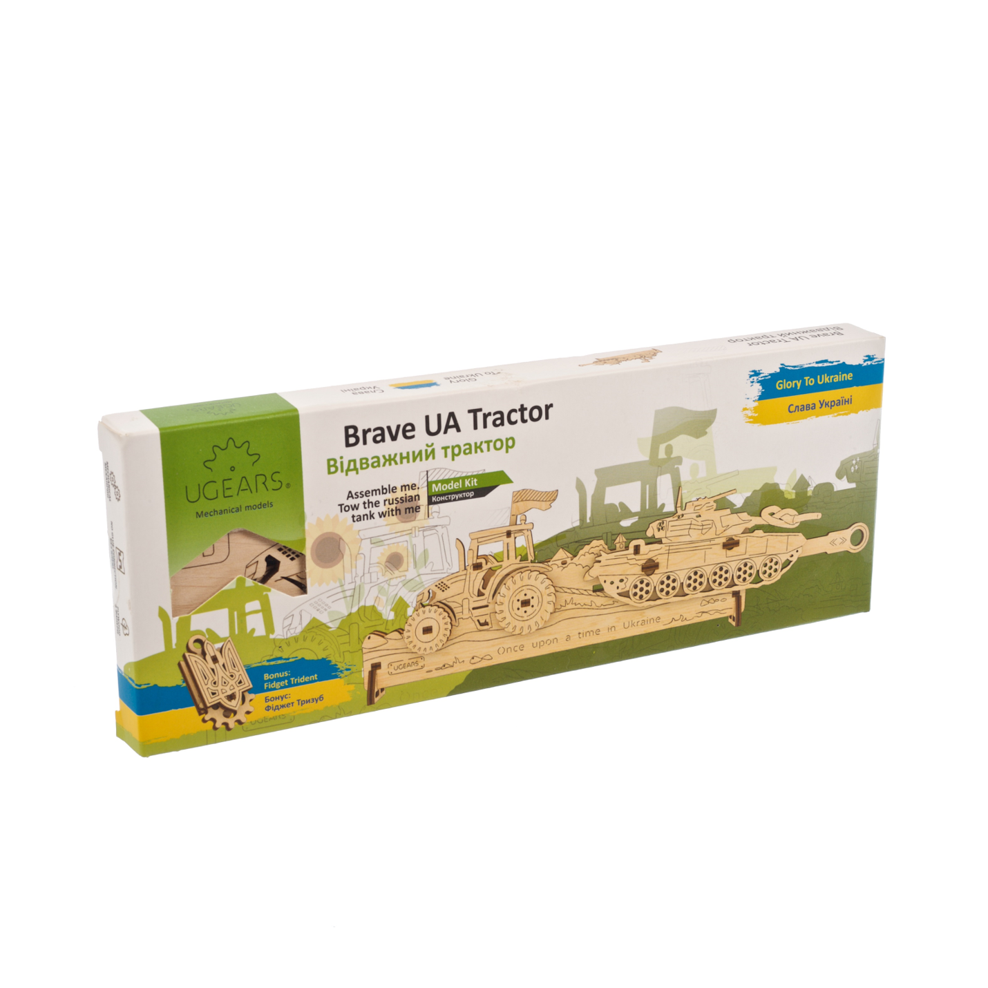Puzzle 3D de Ugears, El Valiente Tractor UA de la serie Era del Coraje, dedicada a la valentía de la nación ucraniana. Sin pilas. Sin pegamento. ¡Gloria a Ucrania!