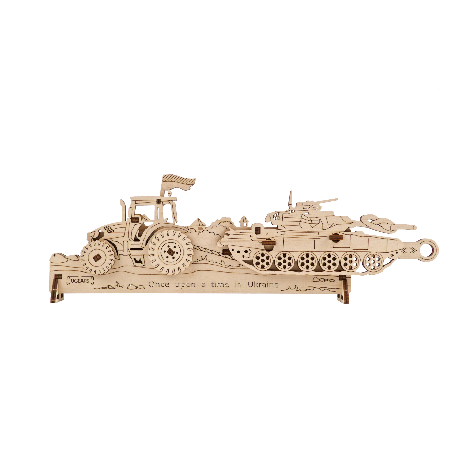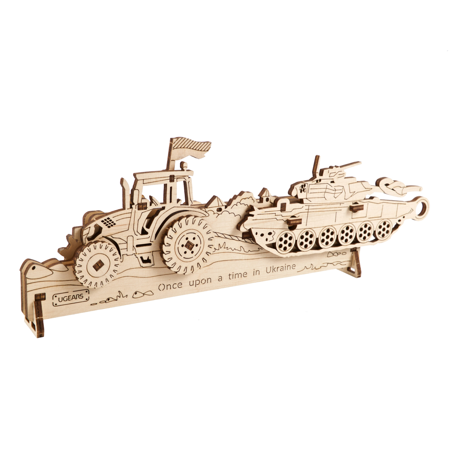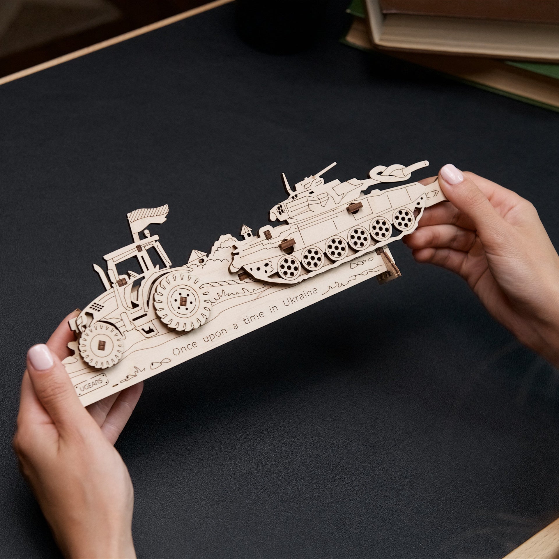 Ugears presenta otra maqueta mecánica de madera de la exclusiva serie especial Era del Coraje en honor a las y los defensores de Ucrania a lo largo de la historia. No solamente los soldados profesionales sino todo el pueblo ucraniano han luchado valientemente contra los invasores rusos que iniciaron la invasión a gran escala en febrero de 2022. El equipo de diseño e ingeniería de Ugears ha creado esta colección para celebrar eventos reales de la presente guerra, en los que civiles y personal militar han demostrado su valor, coraje y entereza. Nosotros llamamos a estas mini-maquetas "historias mecánicas", ya que se basan en eventos reales como el secuestro de un tanque enemigo por un simple tractor de granja.