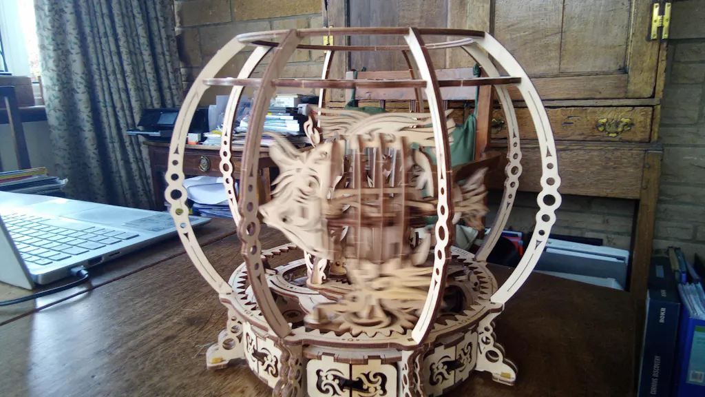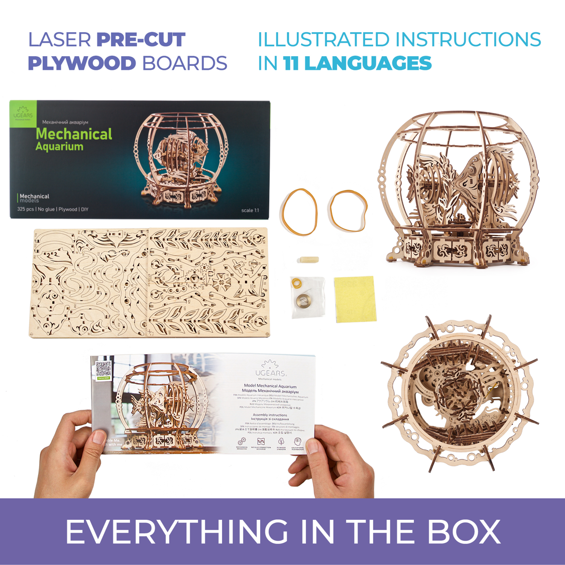 El Acuario Mecánico se compone de 325 piezas, está clasificado como nivel "medio" y el tiempo estimado de montaje es de 6 horas. Al montar el acuario de madera aprenderá cosas nuevas sobre el funcionamiento y la interacción de engranes impulsores y conducidos en los engranajes, sobre la función de péndulos y sobre mecanismos de resorte. Logrará la satisfactoria experiencia de construir algo maravilloso con sus propias manos, sin necesidad de pegamento o herramientas especiales. Todo lo que necesita para este divertido proyecto de bricolaje se encuentra en la caja: las tablas de contrachapado de alta calidad con las piezas precortadas mediante corte preciso de láser – piezas que solamente requieren que se saquen con una ligera presión para encajarlas una con otra; el muelle de metal para el accionamiento del mecanismo, y, por supuesto, las instrucciones detalladas con ilustraciones, disponibles en 11 idiomas.