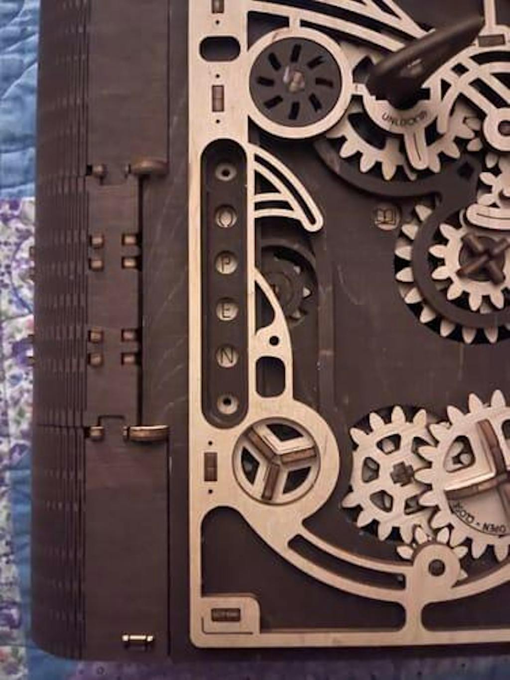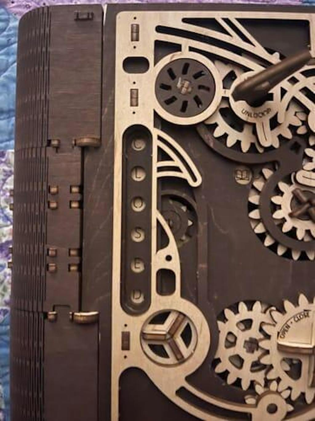 Rated as "medium" difficulty, but there are several steps that are quite tricky (especially with the tumblers) and almost impossible to reverse without damage. The instructions aren't completely clear without first looking closely at the parts and checking next steps to ensure proper orientation. Take your time. The plywood quality isn't the best, so be patient removing parts from the flats or you will lose corners on the gears. You will probably use at least one of the spare parts. Be generous with the wax, and use it on ANY contact surface that moves, not just the gear teeth. Of the ten or so of these that I've built, this was the most annoying. Decent result, although mine had a bit of twist on a corner and minor blemishes due to the need to redo several steps.