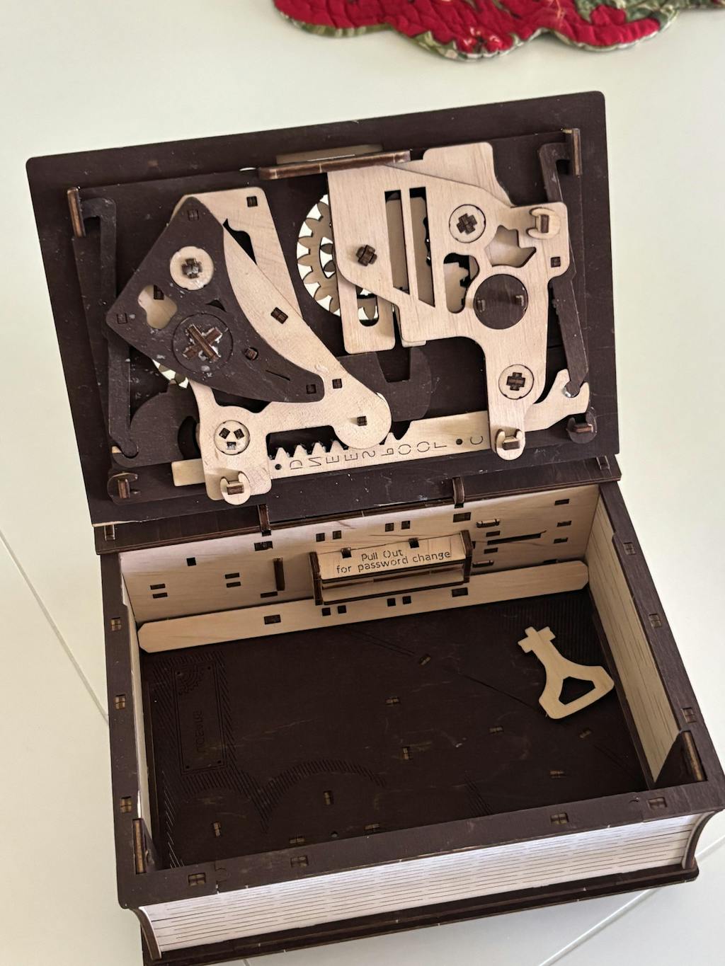 En su Libro de Secretos de Ugears podrá fijar cualquier combinación de tres dígitos retirando el bloque interior del el compartimento secreto. Gire los discos a la combinación deseada y vuelva a insertar el bloque interior. El mecanismo para liberar la llave funcionará ahora con la combinación que usted ha configurado. Al pulsar la palanca en la parte de abajo del lomo del libro, la llave saltará de su ranura en la parte superior del lomo. La palanca no sacará la llave, si los tres tambores están configurados con otra secuencia numérica. Podrá cambiar la combinación de tres dígitos cuando quiera, siguiendo la misma secuencia — abrir el cofrecito 3D de madera, retirar el bloque interior, cambiar la combinación, volver a insertar el bloque interior; después el mecanismo para liberar la llave está configurado con la nueva combinación.