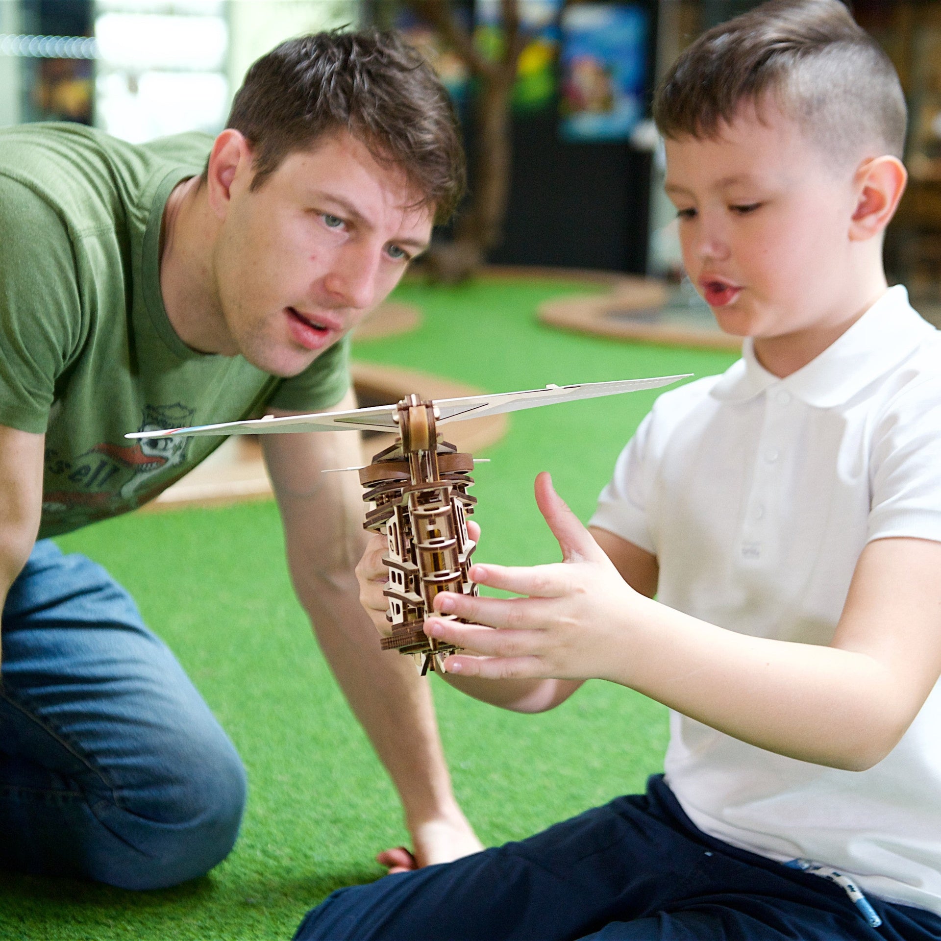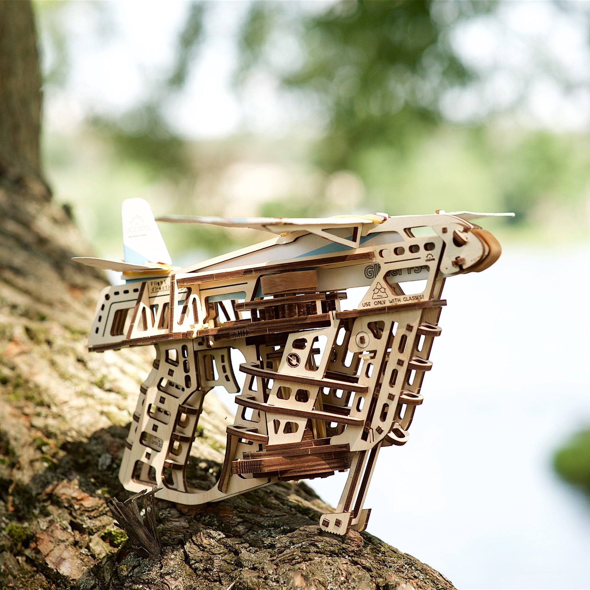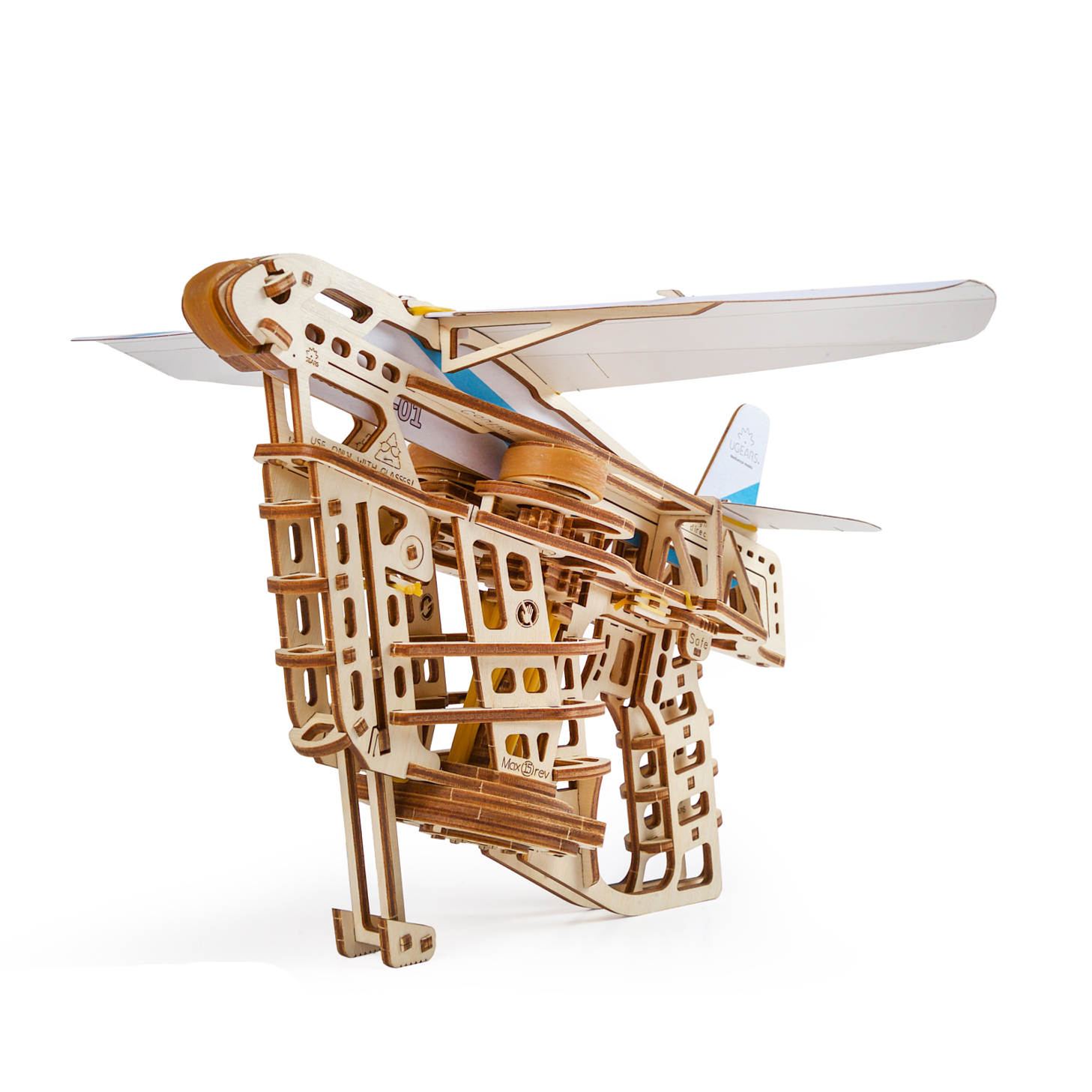 Maquette mécanique en bois Ugears, un lanceur pour planeurs fournis avec le kit. Assemblage sans colle. L'idée cadeau parfaite !