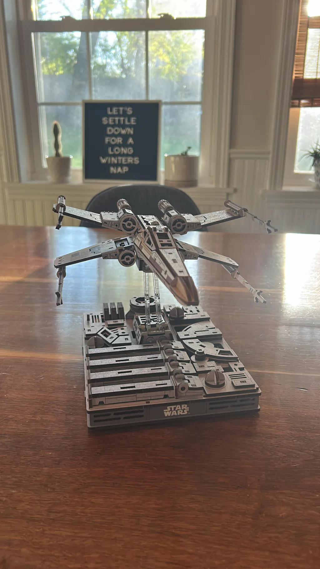 Cette maquette deux-en-un comprend un socle inspiré de la surface de l'Étoile de la mort. À l'intérieur du socle, un mécanisme pivotant motorisé reproduit les manœuvres du X-Wing, telles qu'elles apparaissent dans le film original Star Wars. Le chasseur et le socle se connectent et se détachent à l'aide d'un aimant. Plusieurs éléments mobiles ajoutent au réalisme et au plaisir : la verrière du cockpit s'ouvre, les trains d'atterrissage avant et arrière peuvent être retirés, un bouton en forme de R2-D2 situé sur le dessus du fuselage ouvre une trappe inférieure, mais la principale caractéristique mécanique réside dans les ailes en S qui s'ouvrent et se verrouillent en position d'attaque. La maquette est alimentée par trois piles AA ou via une connexion USB Type-C (piles et connecteur USB non inclus).