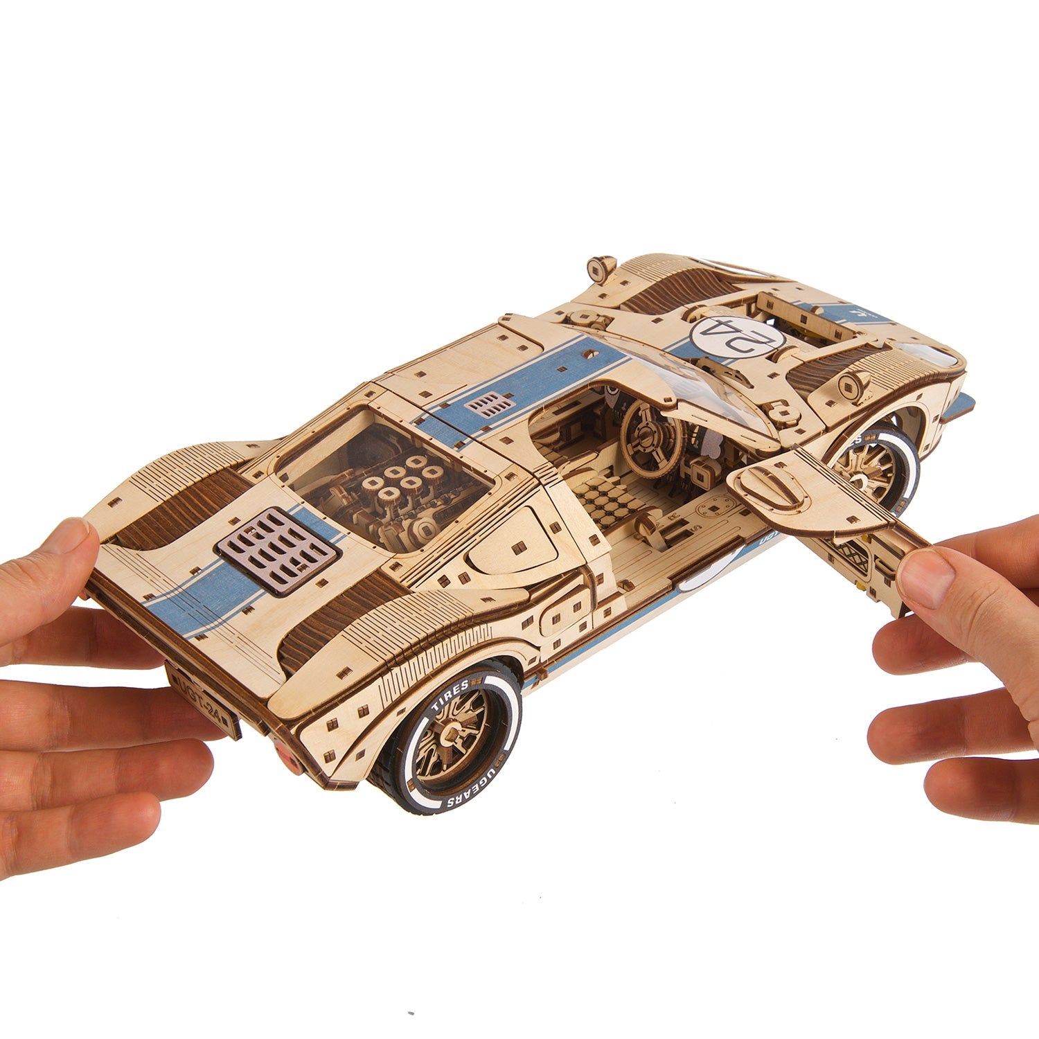Nouveau puzzle 3D en bois UGT-24 Voiture d'Endurance de Ugears. Une voiture avec une bande de course bleue et des fenêtres en plastique parcourt 5-6 m grâce à un moteur à ressort.
