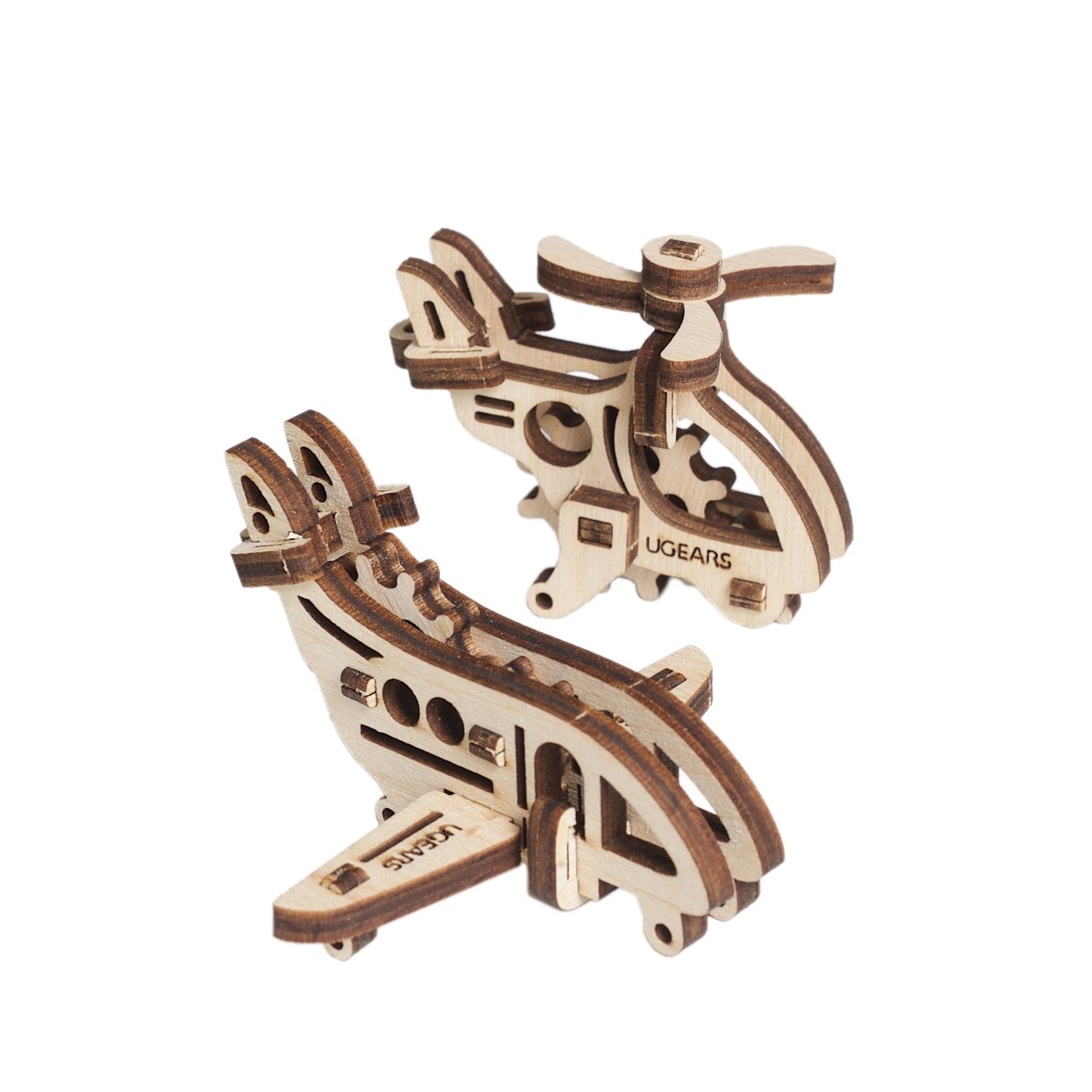 Puzzles 3D bois Ugears : Hélicoptère, Hydravion, Dirigeable, Avion avec éléments de mécanique. Les modèles sont équipés d'œillets pour accrochage. Assemblage sans colle.