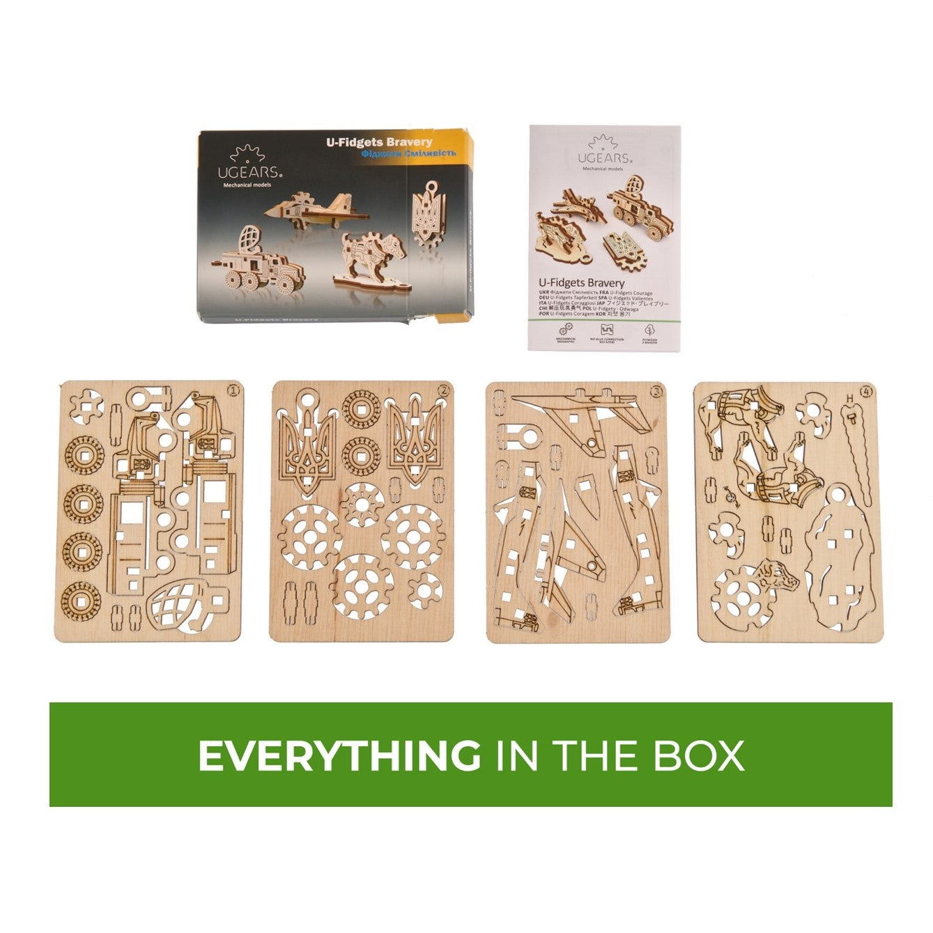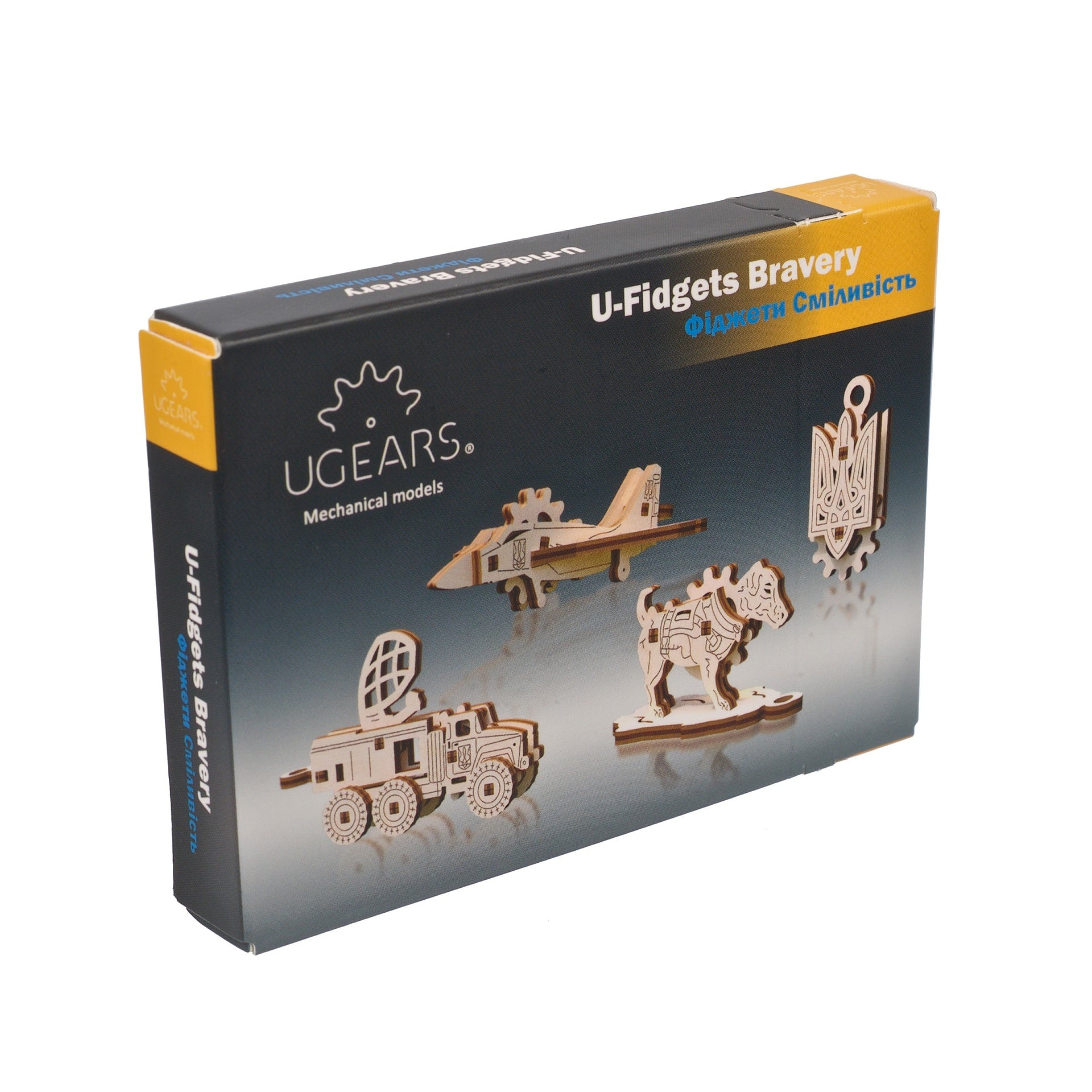 Kit mini-modèle Le Fidgets Courage Ugears. Chaque fidget à construire soi-même possède un élément rotatif. Assemblage sans colle. L'Ukraine va gagner !