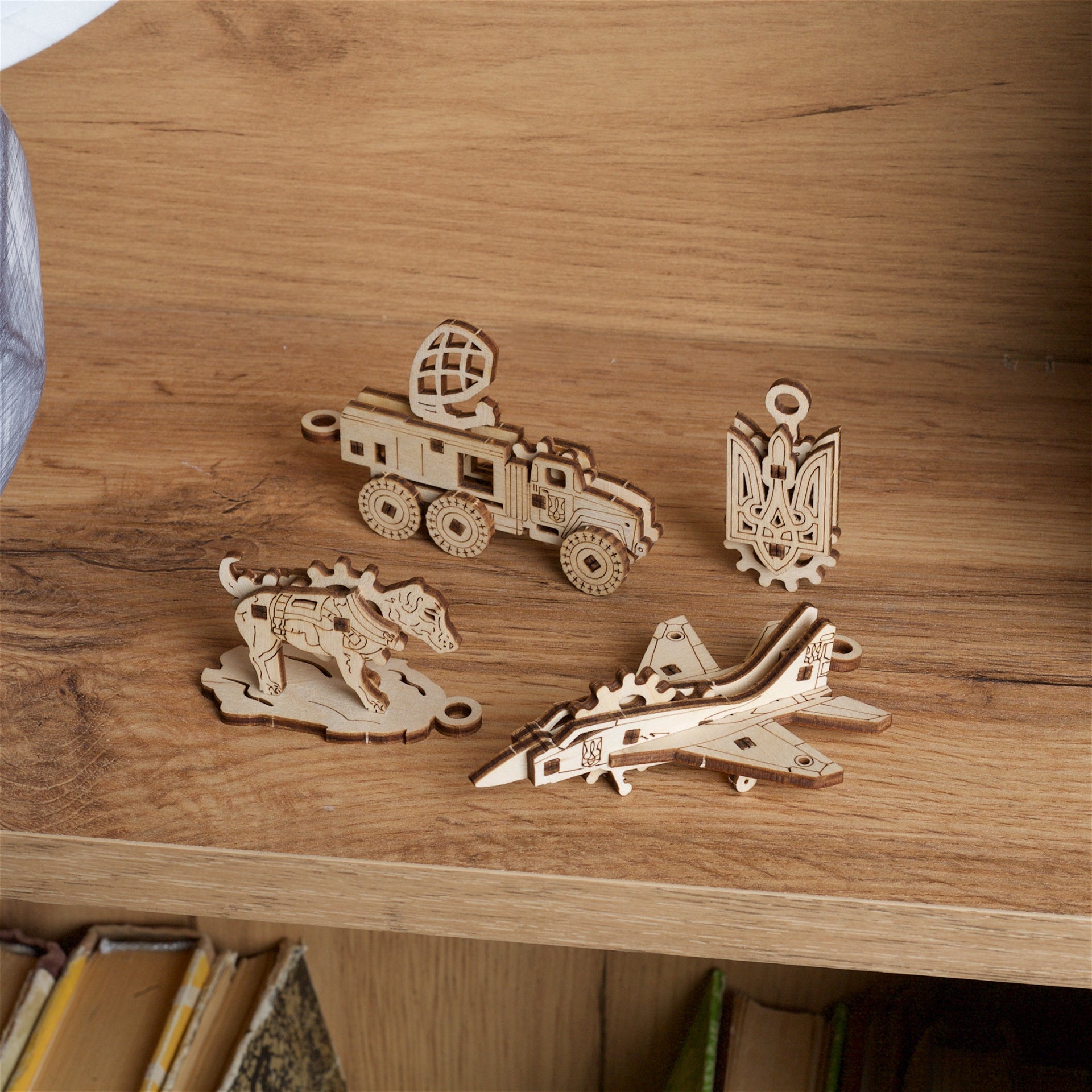 La série de U-Fidgets « Courage » de Ugears célèbre l’esprit combatif des forces armées ukrainiennes. Le lot contient quatre petites figurines en bois que vous assemblez vous-même, chacune constituée d’éléments mécaniques simples :