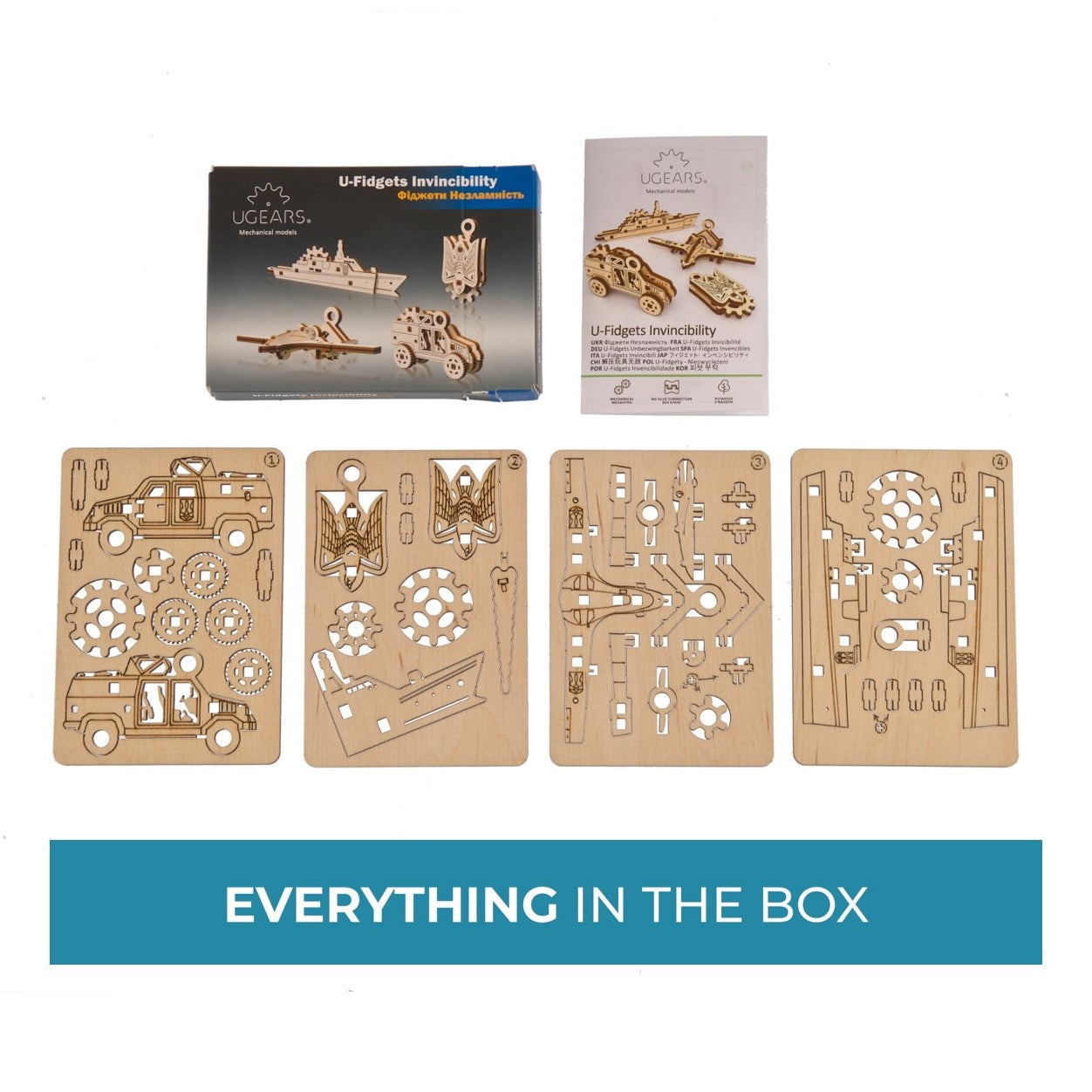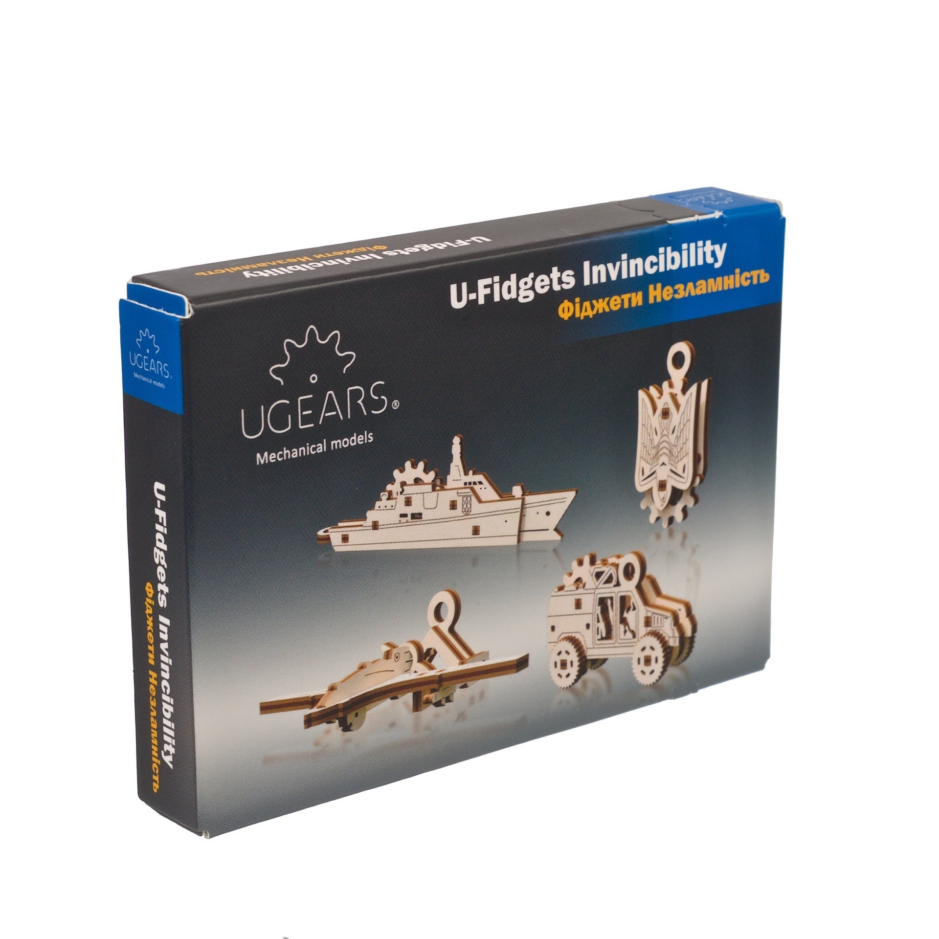 Kit mini-modèle Le Fidgets Invincibilité Ugears. Chaque fidget à construire soi-même possède un élément rotatif. Assemblage sans colle. L'Ukraine va gagner !
