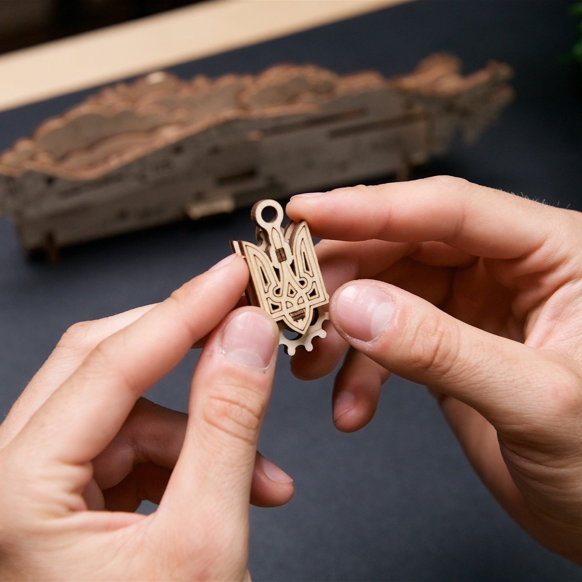 Chaque kit de la série Âge de la Bravoure contient une surprise supplémentaire : un Fidget trident. Ce modèle miniature Ugears est un souvenir original doté d'une fonctionnalité mécanique propre et d'une patte pour le suspendre ou l'utiliser comme porte-clés patriotique et élégant. Le trident est le blason de l'Ukraine, symbole de sa force, de sa liberté et de son esprit indomptable.