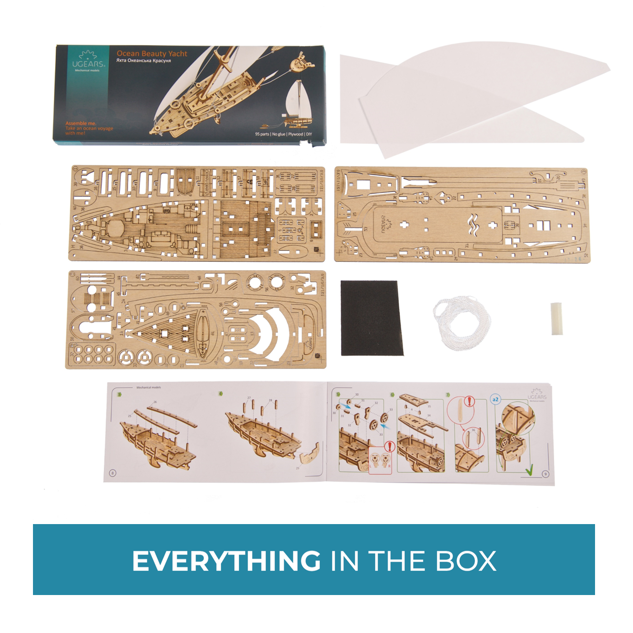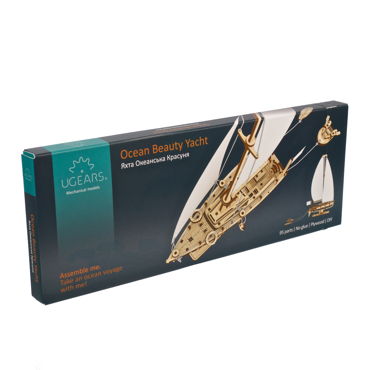 Puzzle 3D Ugears Le Yacht Beauté de l’océan. La maquette est équipée d'une grande voile incurvée avec bôme pivotante et d'un foc triangulaire. Avance sans piles. Assemblage sans colle. Le cadeau idéal !