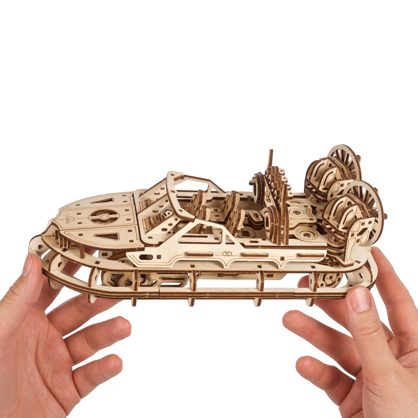 Puzzle 3D en bois Ugears Aéroglisseur de sauvetage. Ce bateau est doté d'hélices qui tournent et réalise des virages à droite et à gauche sur 3 m en oscillant doucement.