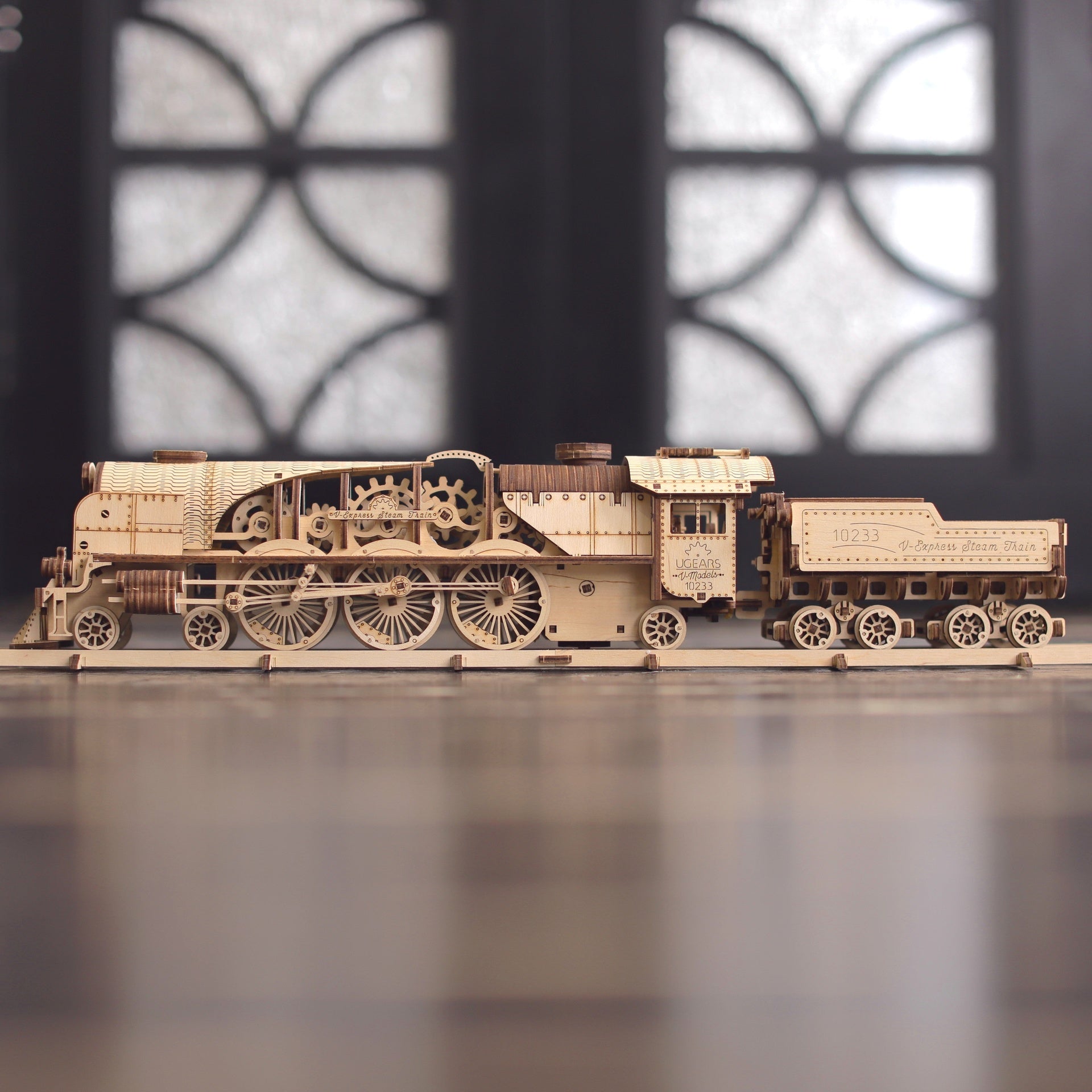 Kit de modélisme Ugears Train à vapeur V-Express avec tender. Ce modèle fonctionnel est une copie miniature de locomotive à vapeur avec 2,45 m.