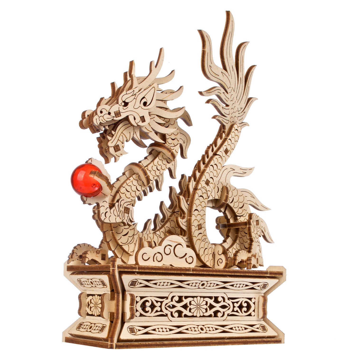 Le Dragon de bois Ugears est une boîte puzzle en 3D et une maquette à monter soi-même représentant un dragon porte-bonheur qui tient une perle rouge flamboyante dans sa griffe gauche. Le long dragon de bois, enroulé et doté de quatre membres, s'inspire des représentations de dragons dans l'art chinois. Il repose sur un support spécial doté d'un tiroir caché qui s'ouvre lorsque l'on appuie sur un bouton secret, déguisé en fleur (le tiroir se referme manuellement). Le dragon est entièrement détachable et peut être posé sur n'importe quelle surface et admiré séparément du support. Rangez un message secret, une fortune ou un petit trésor à l'intérieur du socle du Dragon de bois. Vous pouvez même placer une enveloppe rouge spéciale (appelée 紅包, ou hóngbāo) à l'intérieur du tiroir, contenant un cadeau pour le Nouvel An lunaire, puis présenter le Dragon de bois à deux mains et mettre le destinataire au défi d'ouvrir la boîte à trésors !