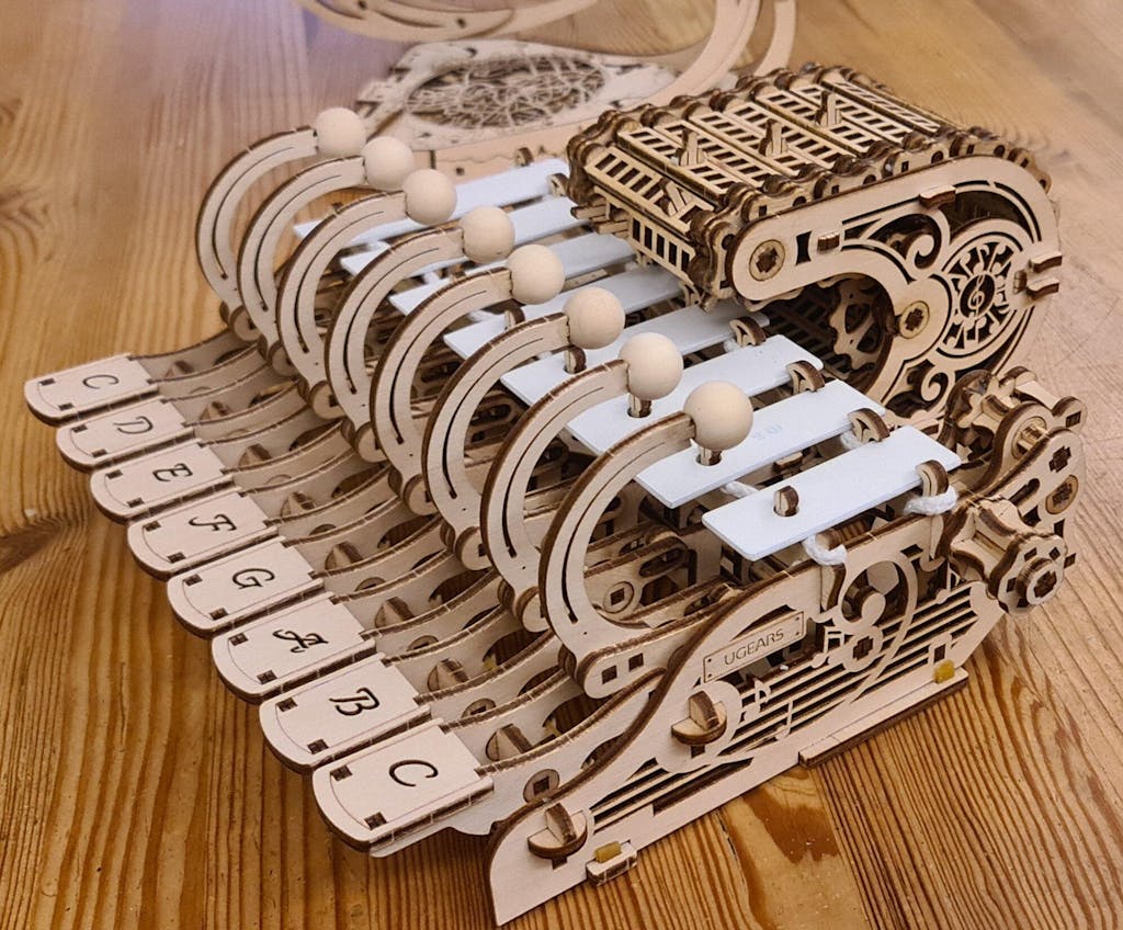 Do Re Mi Fa Sol La Ti Do. Ugears is proud to introduce the second DIY musical instrument in our collection—the Mechanical Celesta. Like the Ugears Hurdy-Gurdy, the Mechanical Celesta is both a wooden mechanical model and a fully functional musical instrument. This special musical model is a simpler version of a pianola and includes elements of a piano, a music box, and a xylophone. Thanks to the Mechanical Celesta's ease of use, even the smallest child or those without any prior musical knowledge can begin to play music, by striking the keys or turning the crank to produce pre-programmed melodies. In "manual mode", when you press a key, the hammer strikes the plate, and the sound of the corresponding note is heard. In "programmed melody mode", you arrange a series of boards along a rotating drum, then turn the drum as pins on each board trigger the hammers to strike the correct notes.