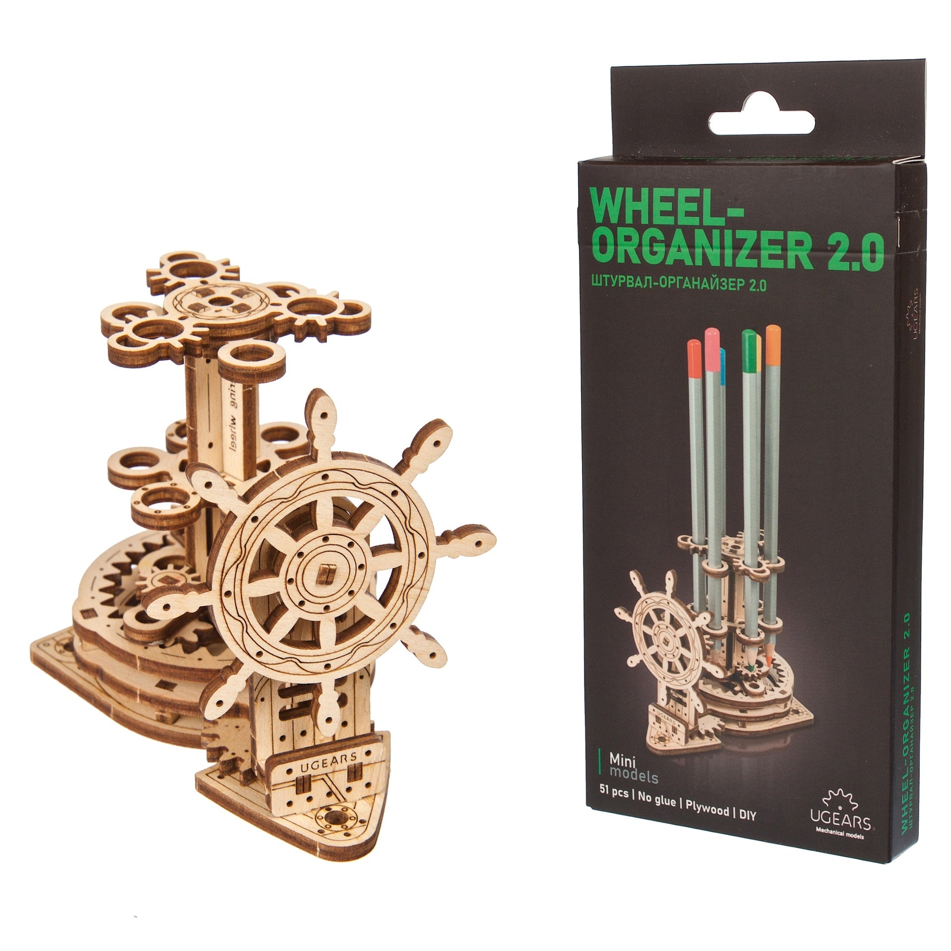 Ugears Wheel-Organizer 2.0: mechanical wooden model kit and kinetic storage unit for up to 6 pens and pencils. Assembles without glue and special tools like a puzzle