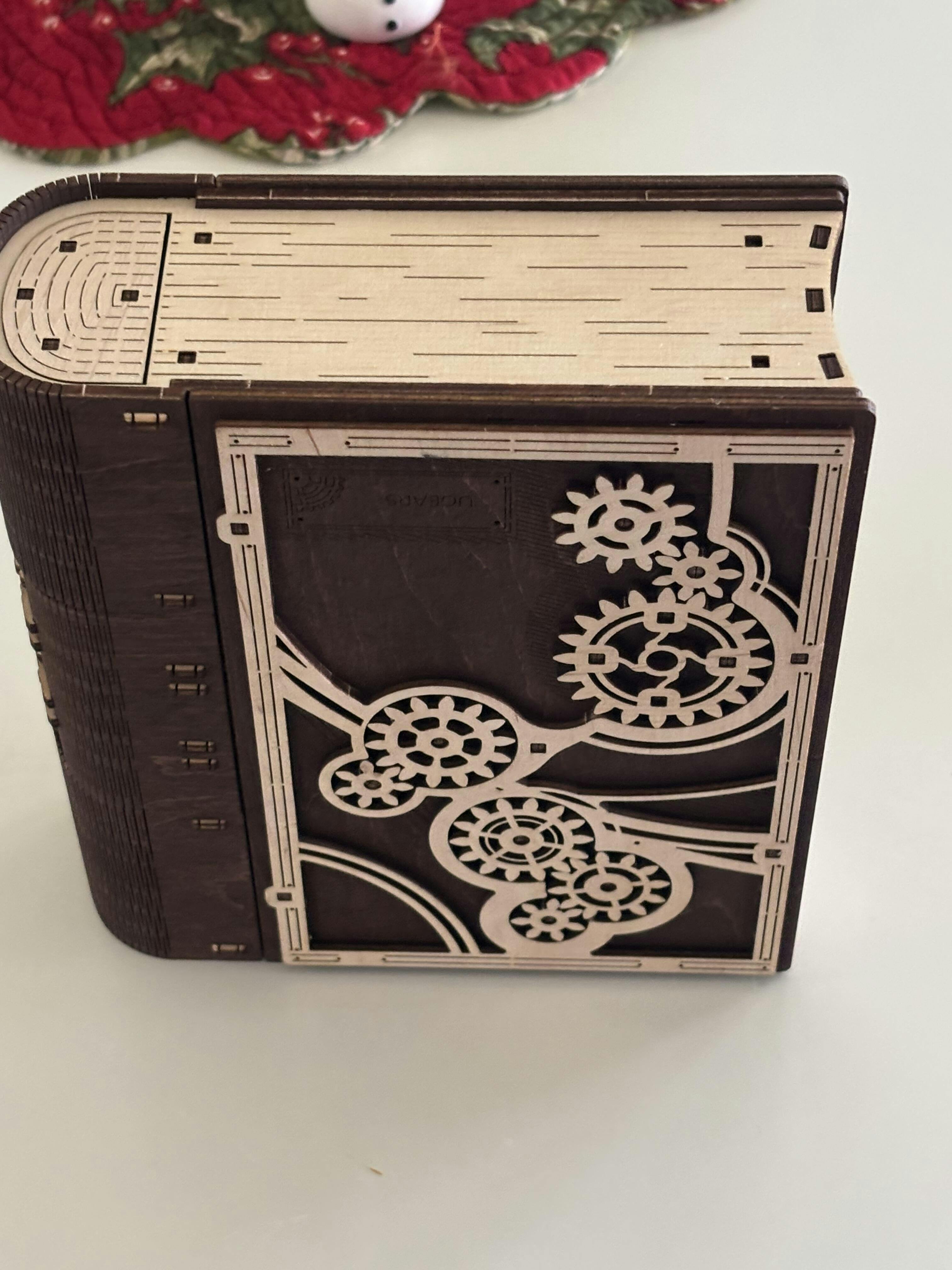 Drewniane puzzle 3D Księga Tajemnic od Ugears. Steampunkowe pudełko z zamkiem szyfrowym z wieloetapową sekwencją otwierania i fascynującą mechaniczną akcją. Kolorowa sklejka. Idealny prezent!