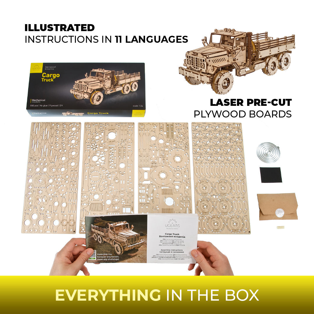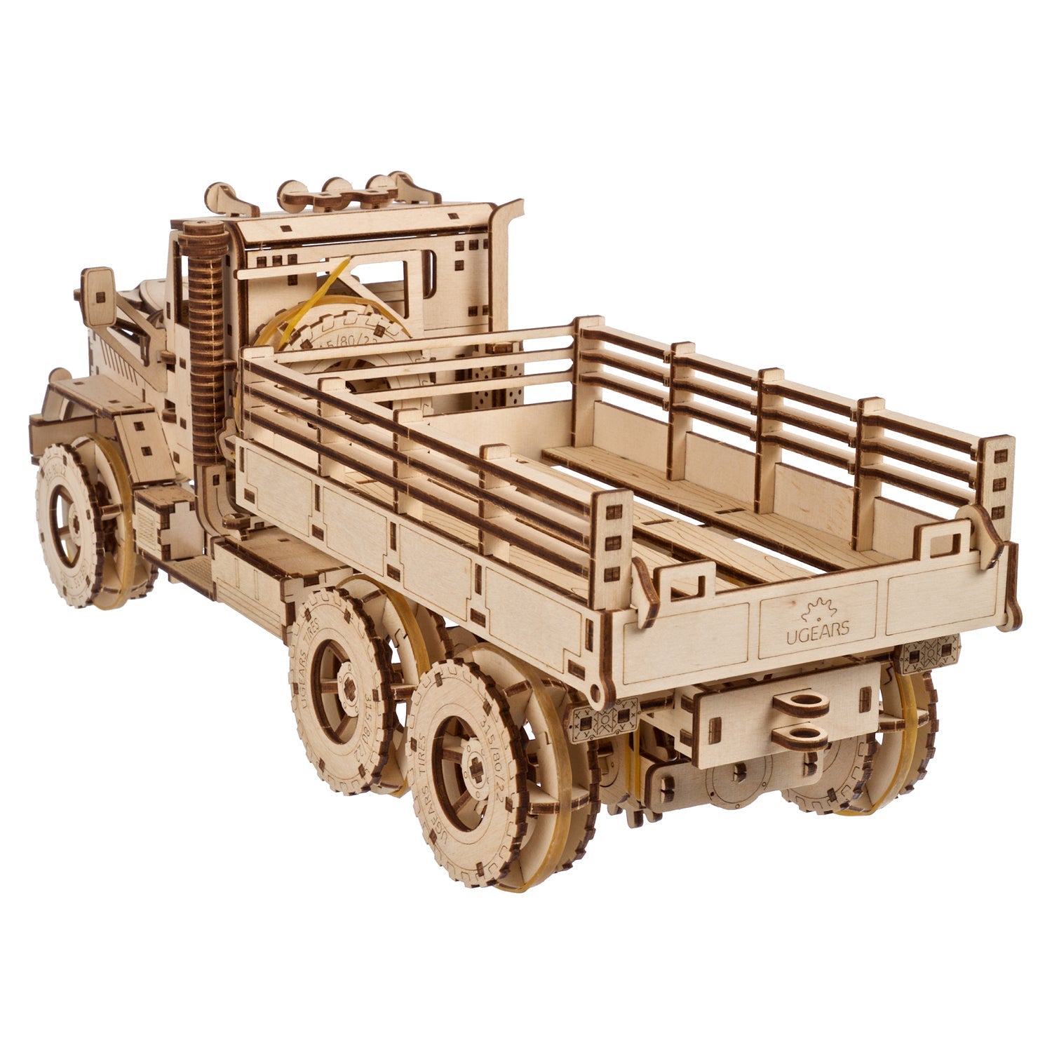 The biggest, boldest 3D wooden model truck can now be yours when you order the Ugears Cargo Truck. This "Advanced" level, spring-powered DIY model truck is best-in-class, with loads of moving parts and exciting, realistic details. Three fully-sprung axles and two differentials—one to the front axle, one to the rear axles—allow your Cargo Truck to conquer any terrain and meet any challenge. Similar to the Mack NO 7 ½ ton 6x6 cargo truck and the Diamond T 4 ton 6x6 used by the U.S. Army and Allies in WWII, the Ugears Cargo Truck is an all-weather, all-terrain, mighty machine.