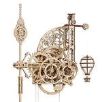 Ugears is proud to present the Aero Clock, a fully functioning wall clock with a pendulum that you can build yourself, mount to a wall, wind up, then watch as the seconds, minutes, and hours tick by. The theme of the Aero Clock is early aeronautics. The casing and intriguing wooden clock mechanism represent an air base located among the clouds, where zephyrs blow and filtered rays of sunlight dapple the machinery, while you, in the role of aeronaut, launch a new voyage of exploration on the hour.