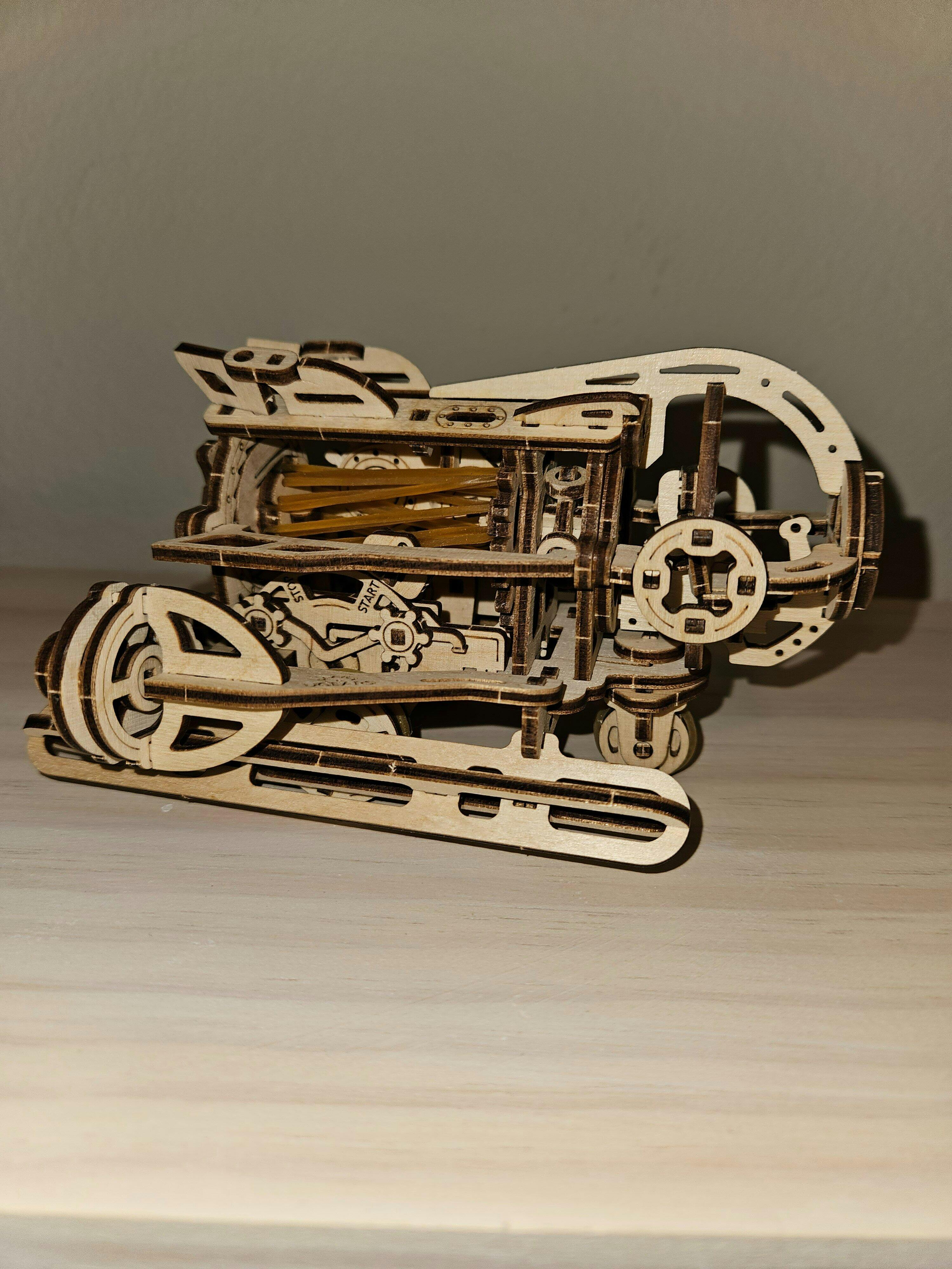 Wooden 3D puzzle Ugears Steampunk Submarine travels about 2.5 meters on its rubber band motor and can make left and right turns. No glue needed. Cool gift idea for everyone.
