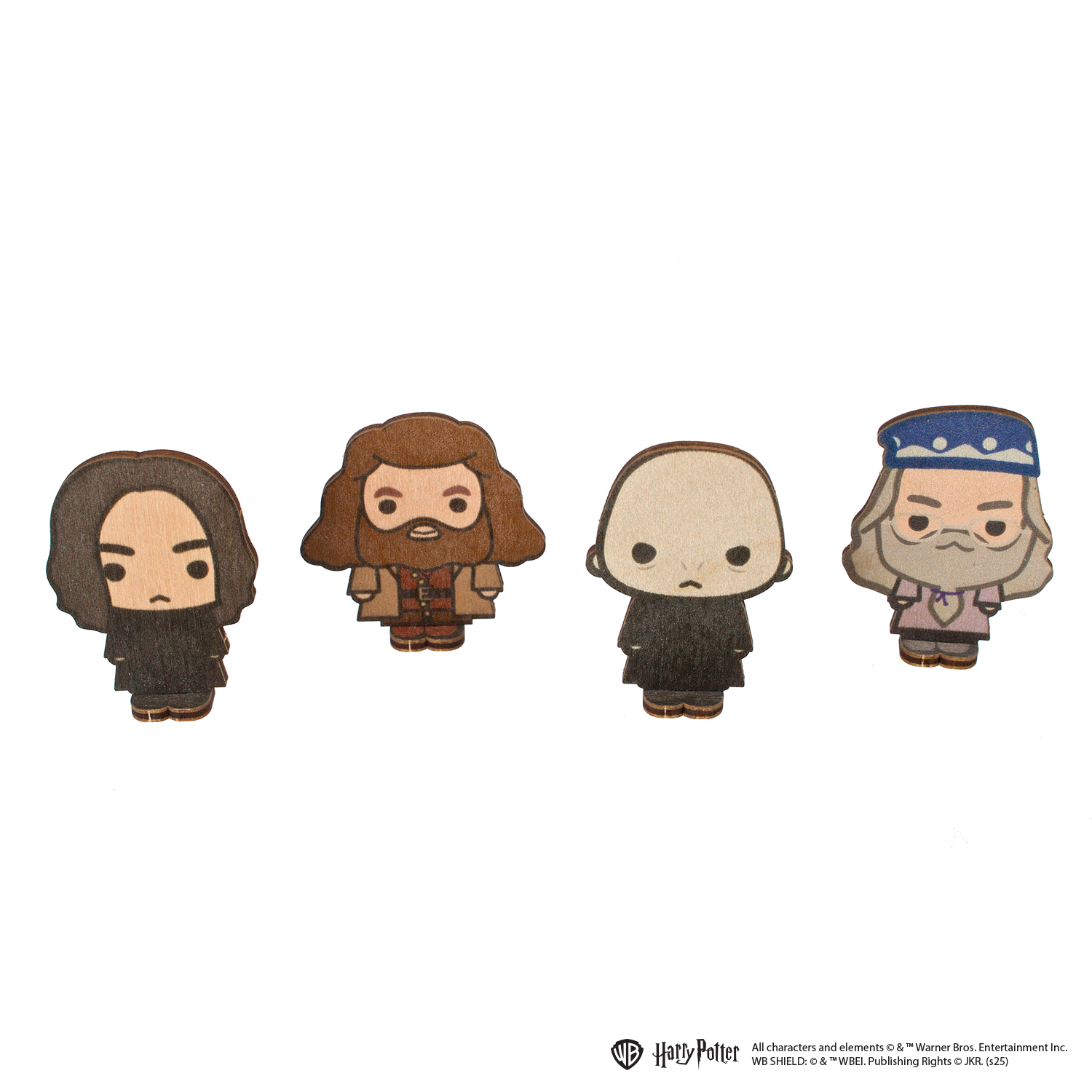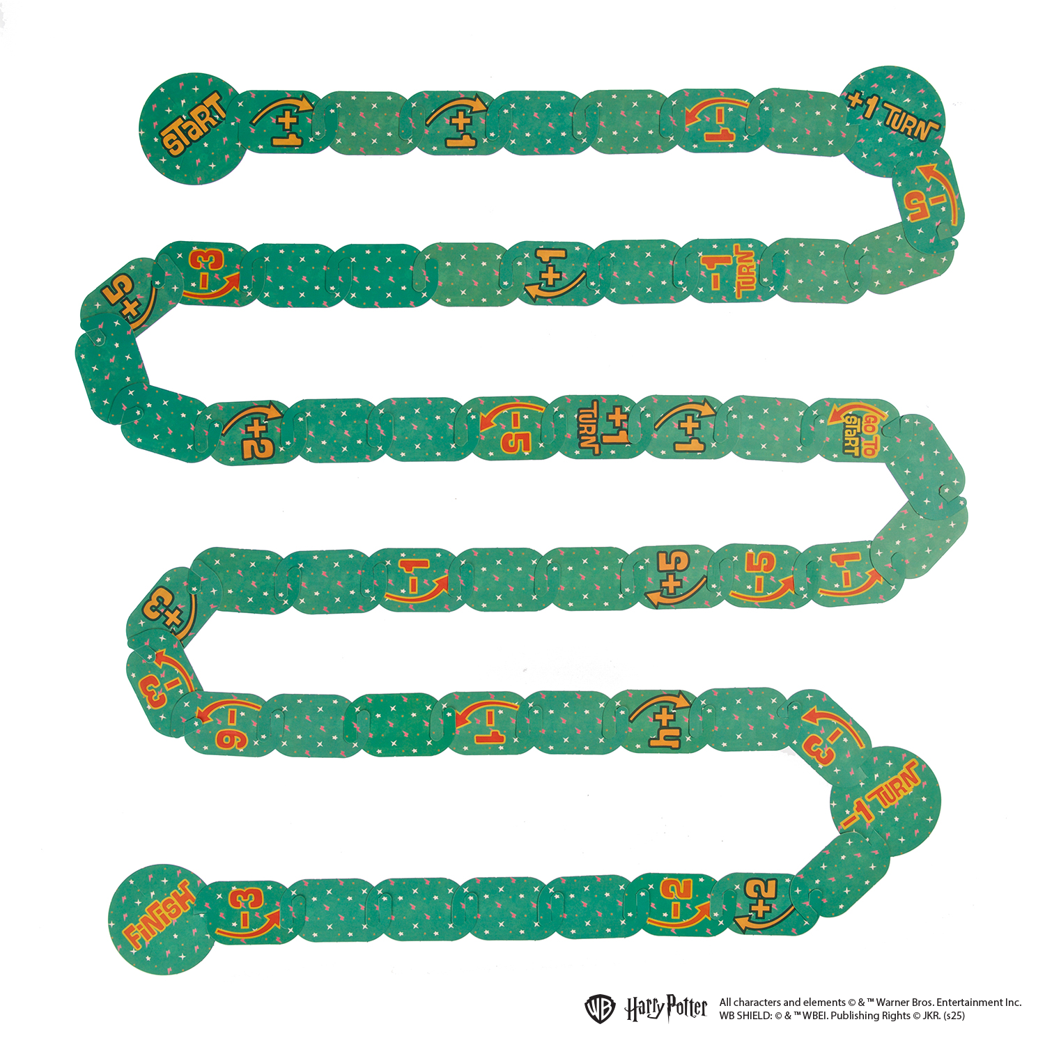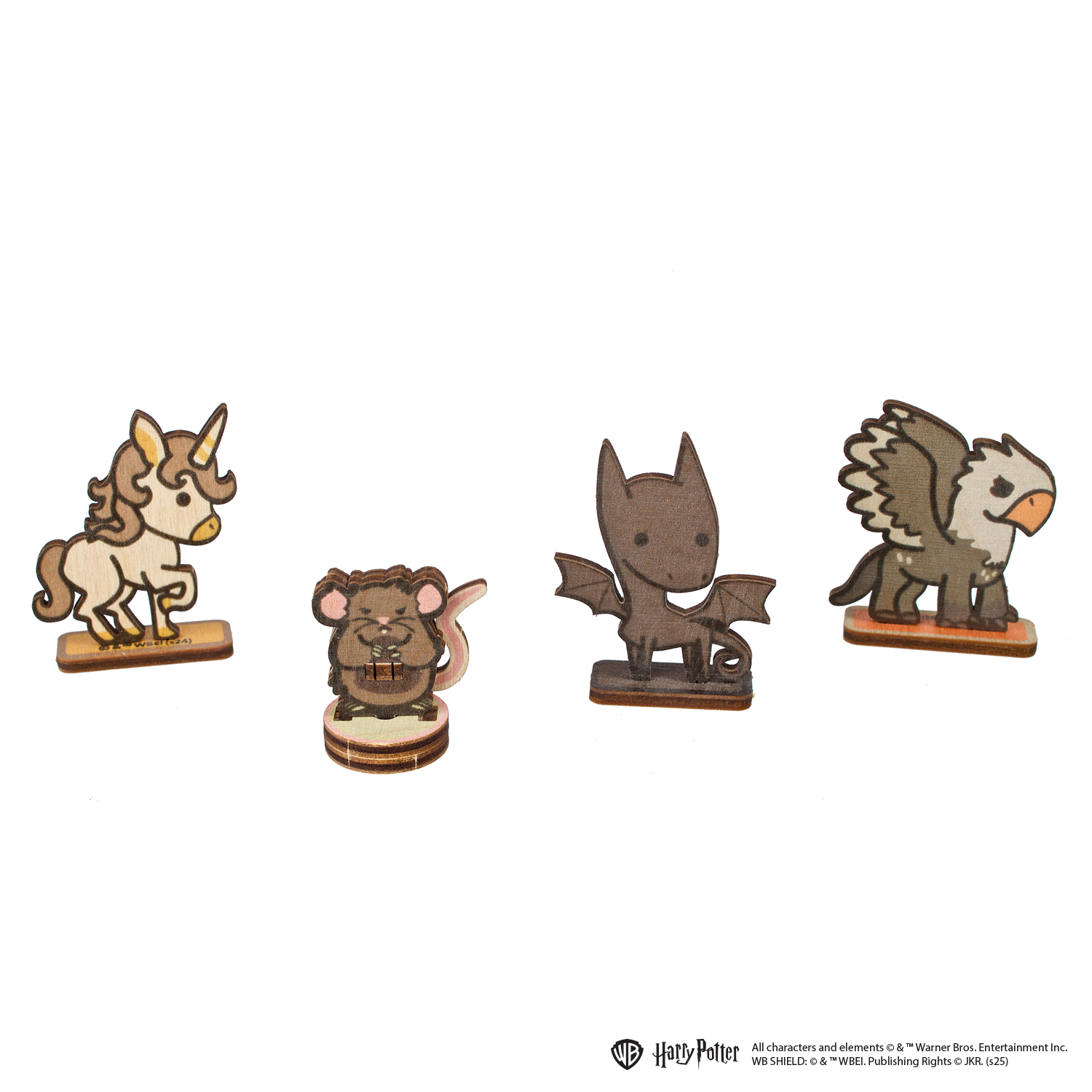 Game pieces include figurines of Dumbledore, Severus Snape, Voldemort, Draco Malfoy, Harry, Ron, Hermione, a Hippogriff, Hagrid and more! Some of the figurines feature movable parts: Harry, Ron, Hermione, and Draco have tiltable heads; the Mandrake can be removed from its pot and placed back in; and the potion cauldron allows you to tilt the potion bottles back and forth.